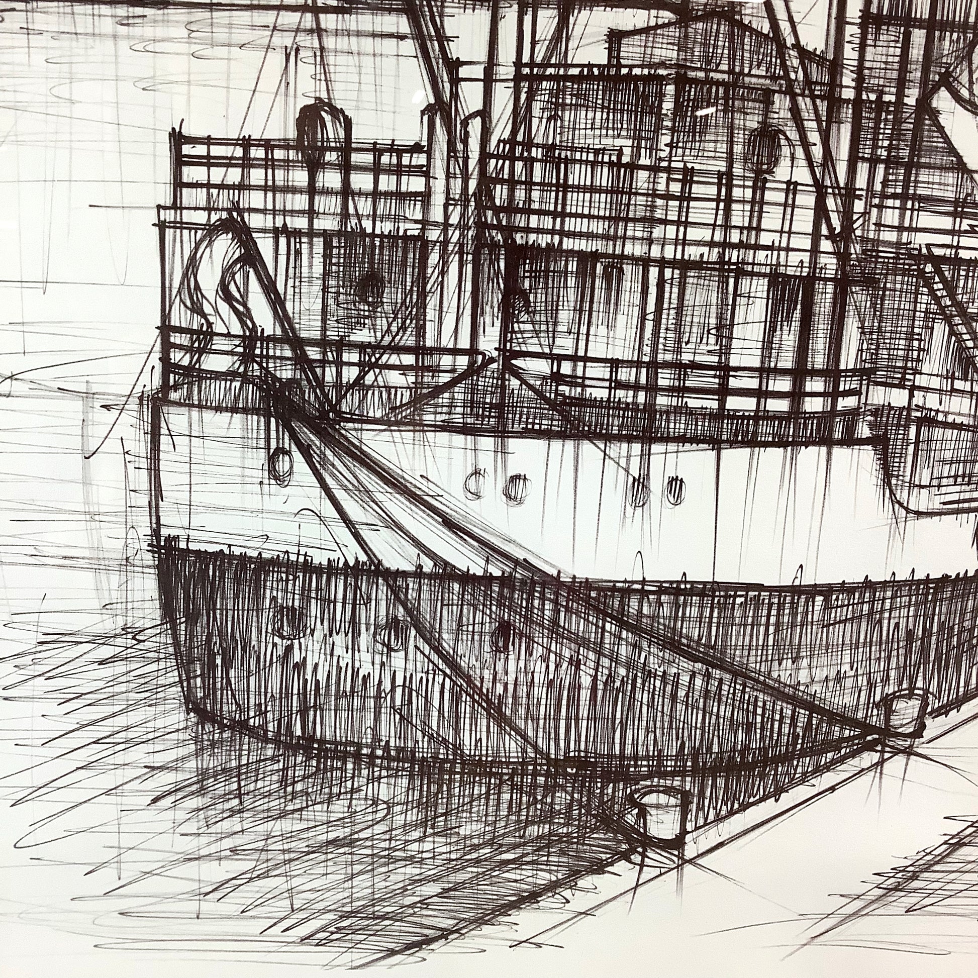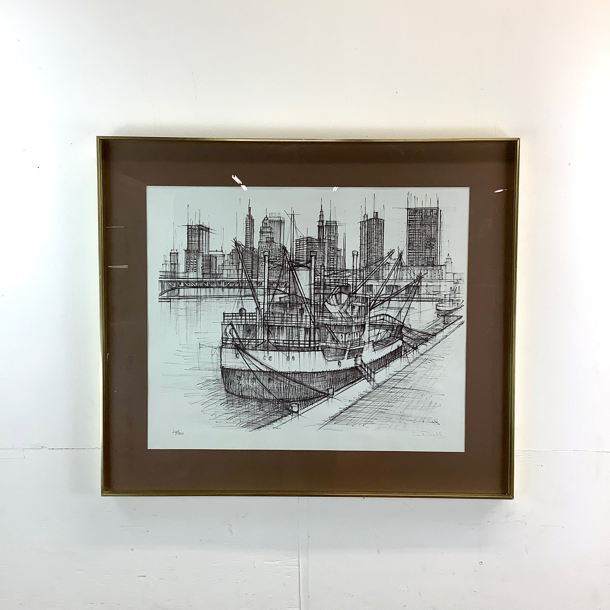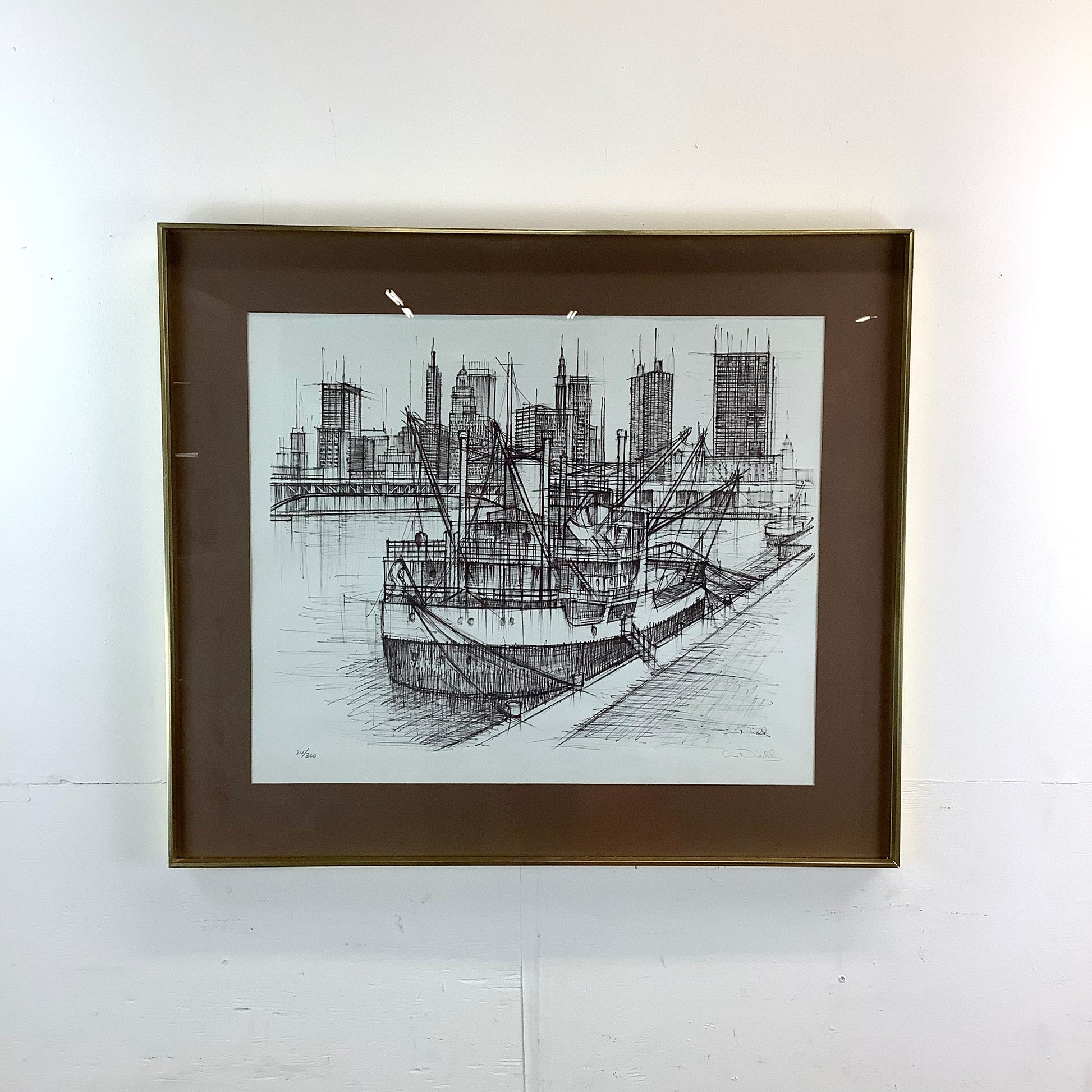 Signed lithograph by Eric Nivelle portrays a harbor scene alive with balance and calm. A large vessel occupies the foreground, with what appears to be New York City rising subtly in the distance.