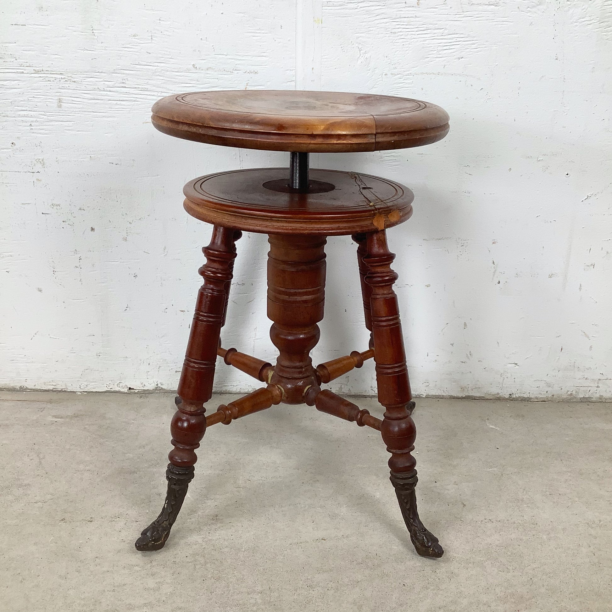 This adjustable piano stool reflects the ornate yet practical design principles of the late nineteenth century. The round seat is defined by a molded edge and fine line detailing, giving the piece a finished, intentional appearance.