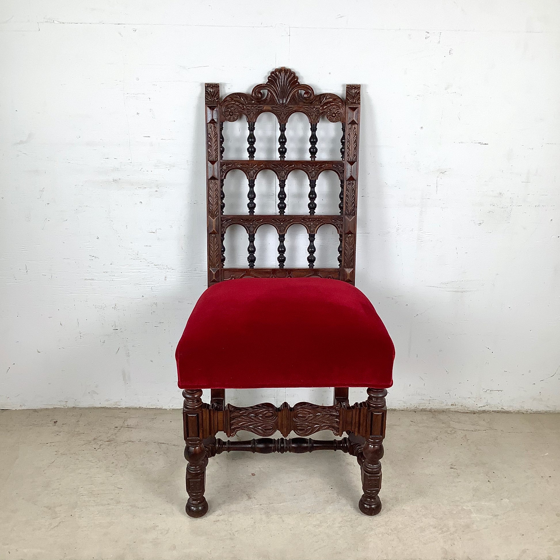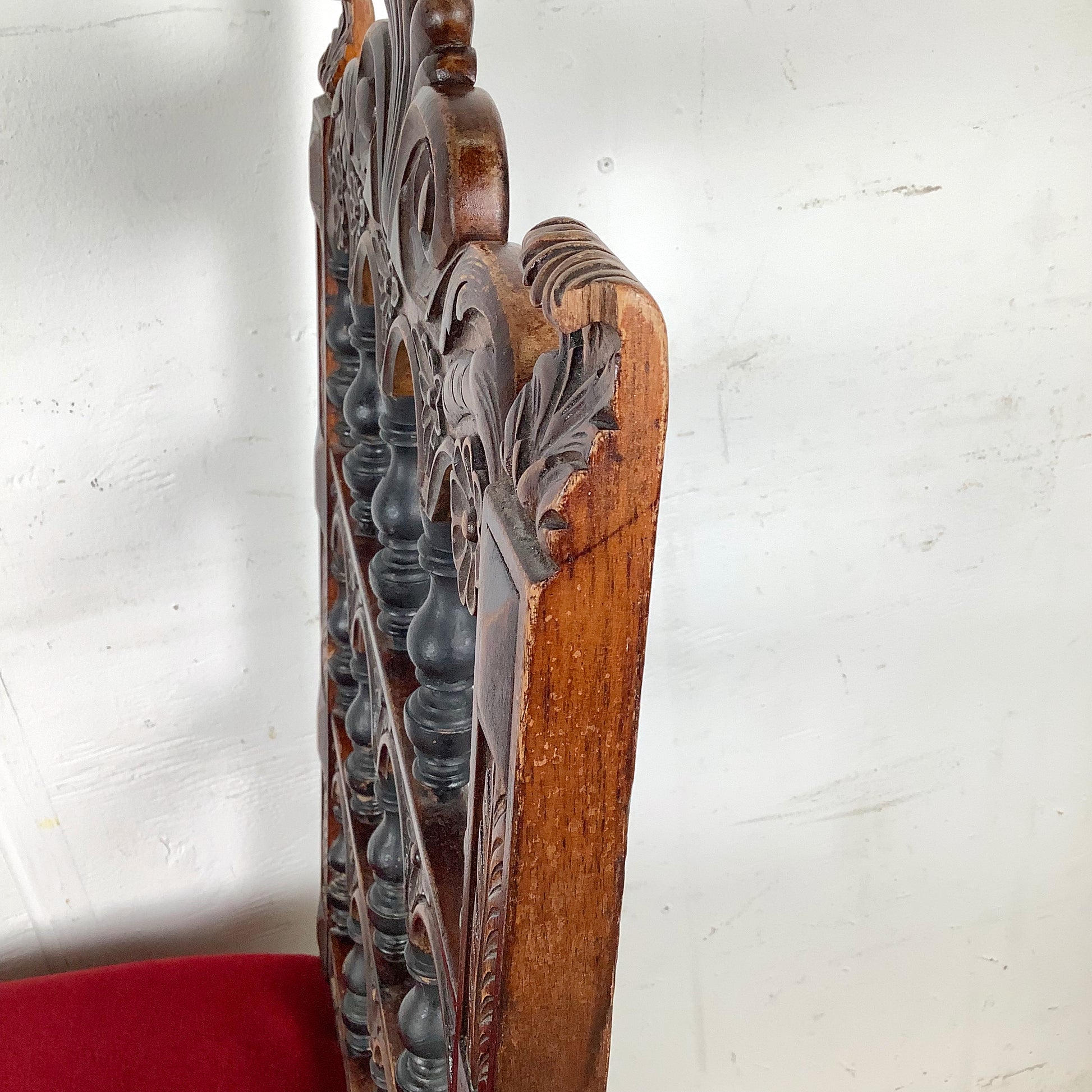 The solid walnut frame features delicate carved details, from scrolling accents to floral motifs, while the plush velvet seat offers luxurious comfort. The deep red upholstery adds a bold touch of color, perfectly complementing the warm tones of the wood.