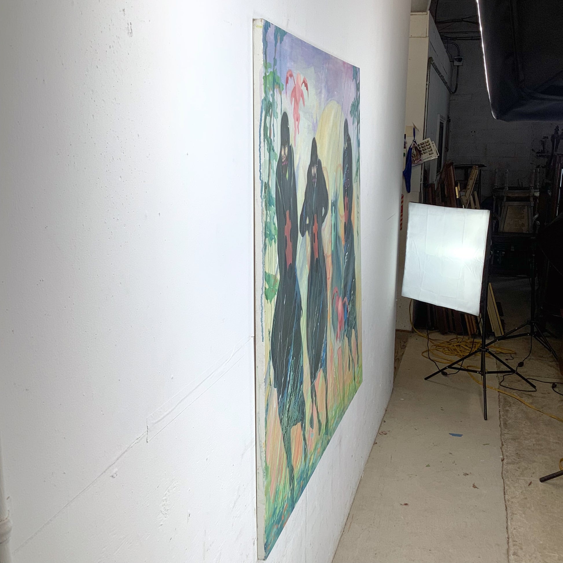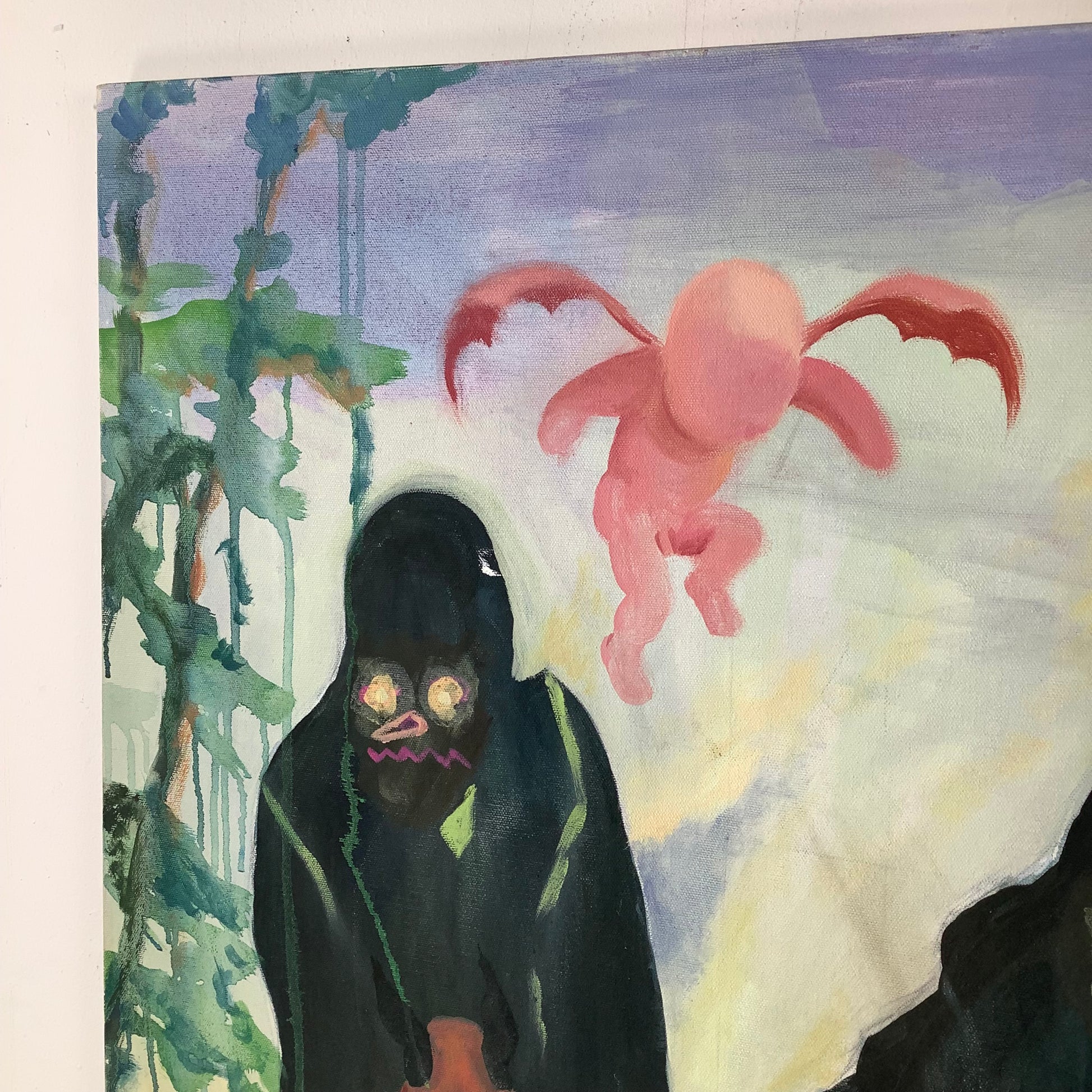 Winged figures move through the scene — forms reminiscent of cherubs yet reimagined through a darker contemporary lens. The symbolism remains fluid, resisting easy categorization.