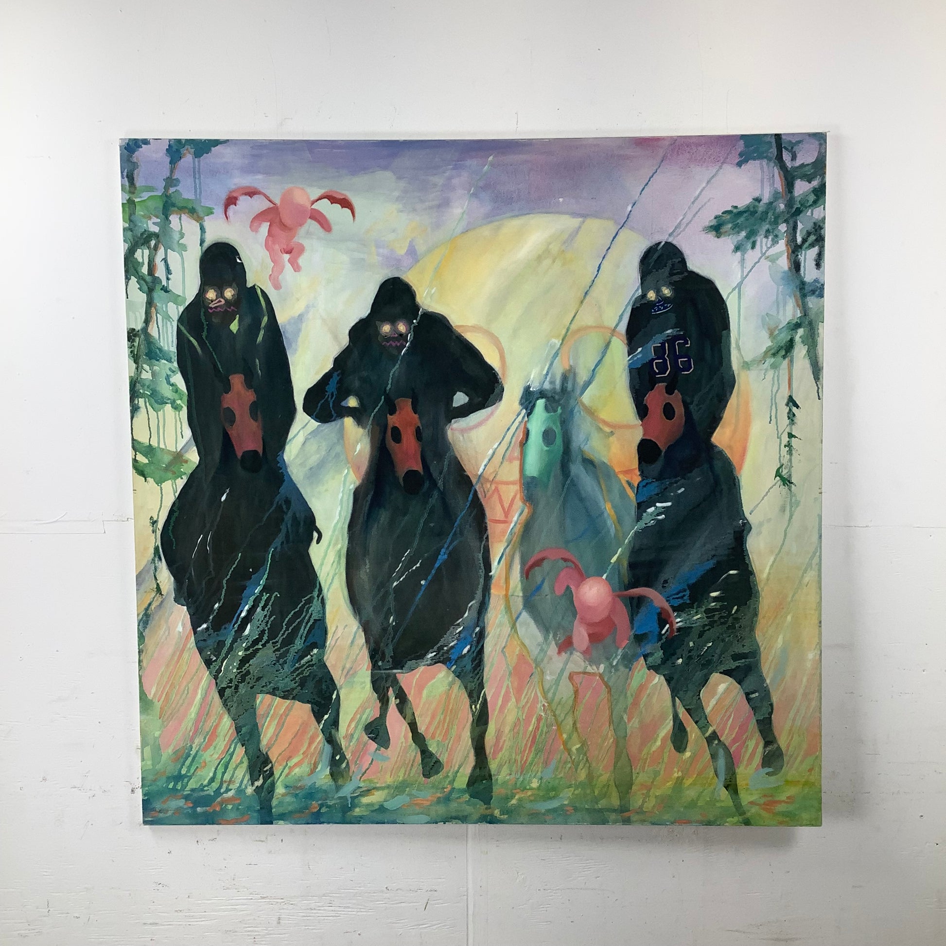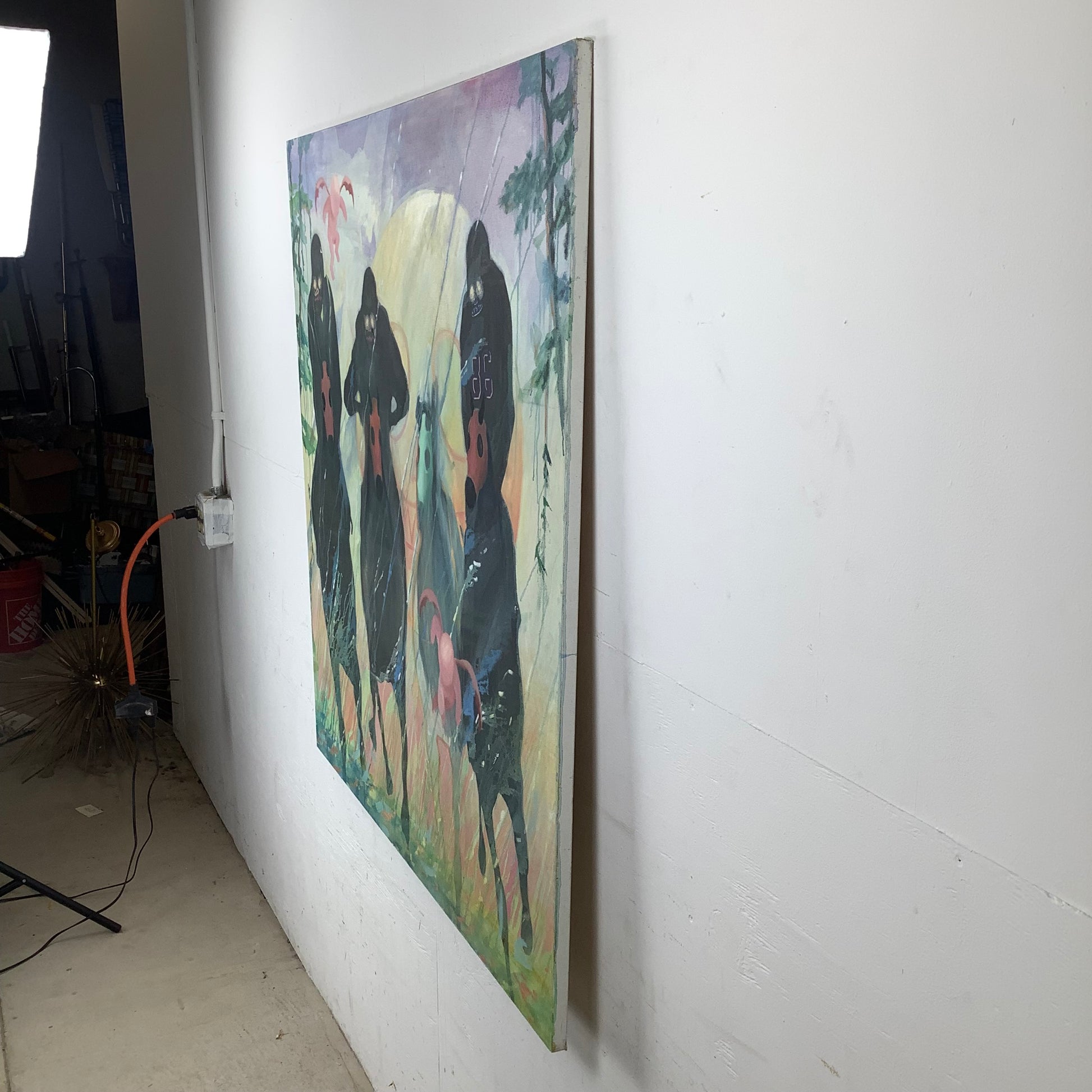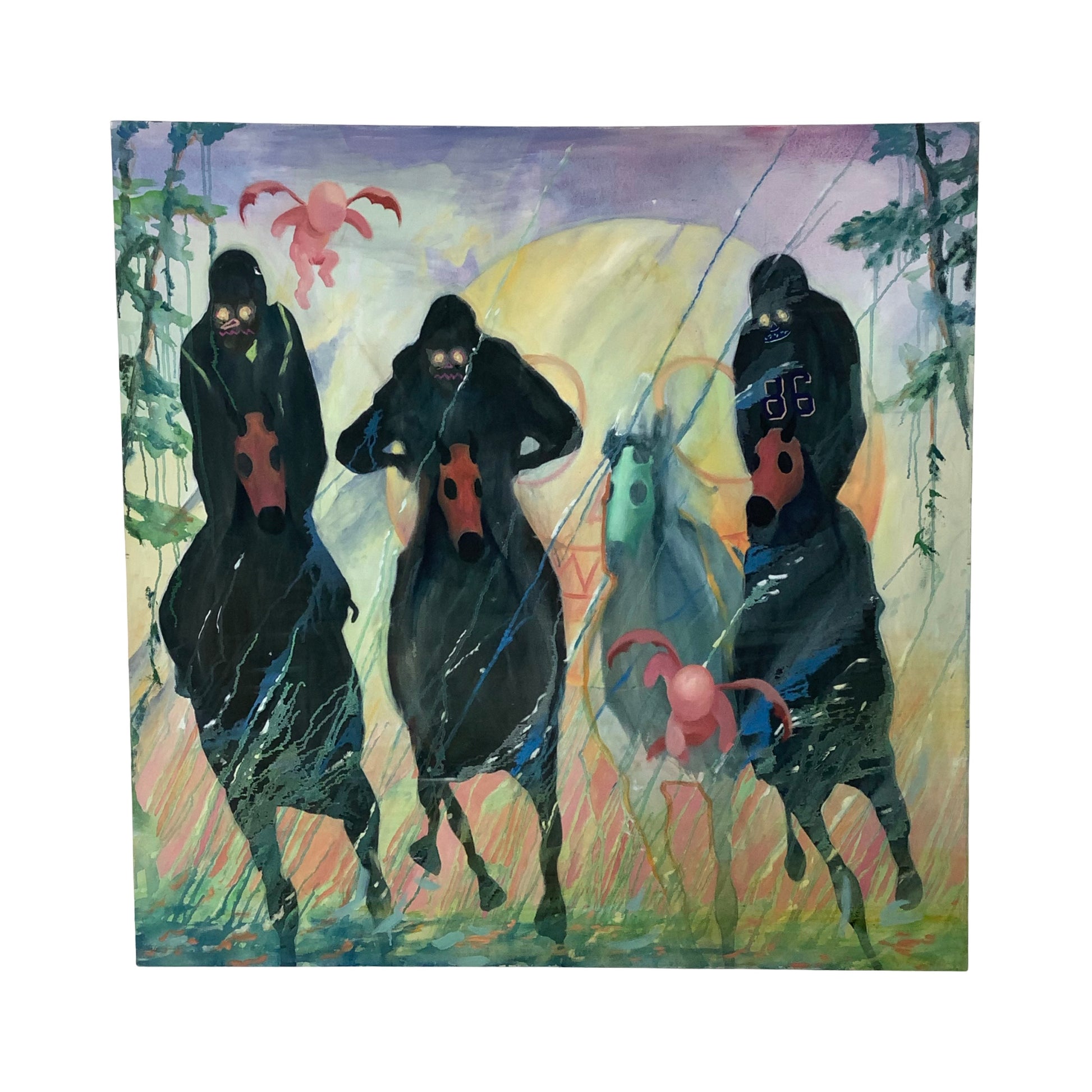 “Back on the Horse” (2014) presents a stark procession: three cloaked riders advancing beneath a glowing celestial form.