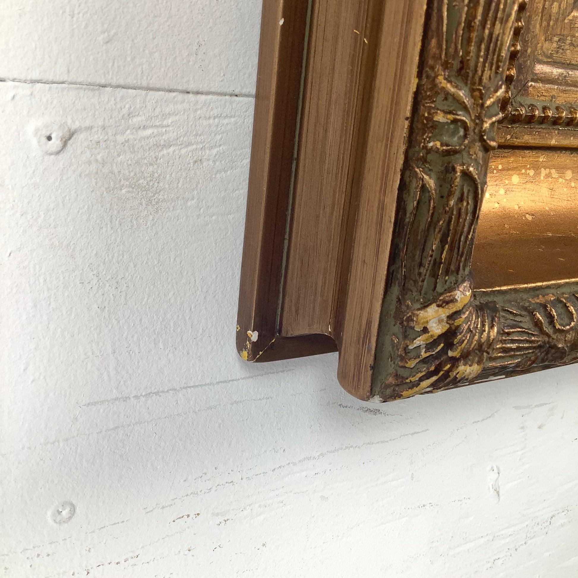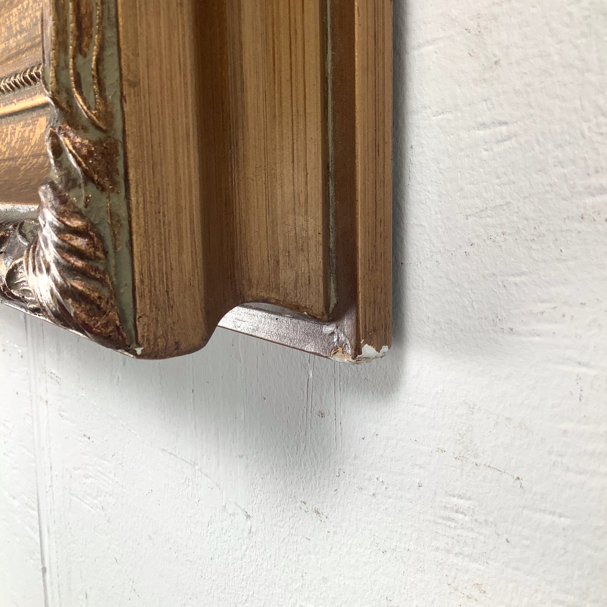 The artwork is presented in a substantial carved wood frame with an ornate gilt finish and an attractively aged surface that adds warmth and visual interest.