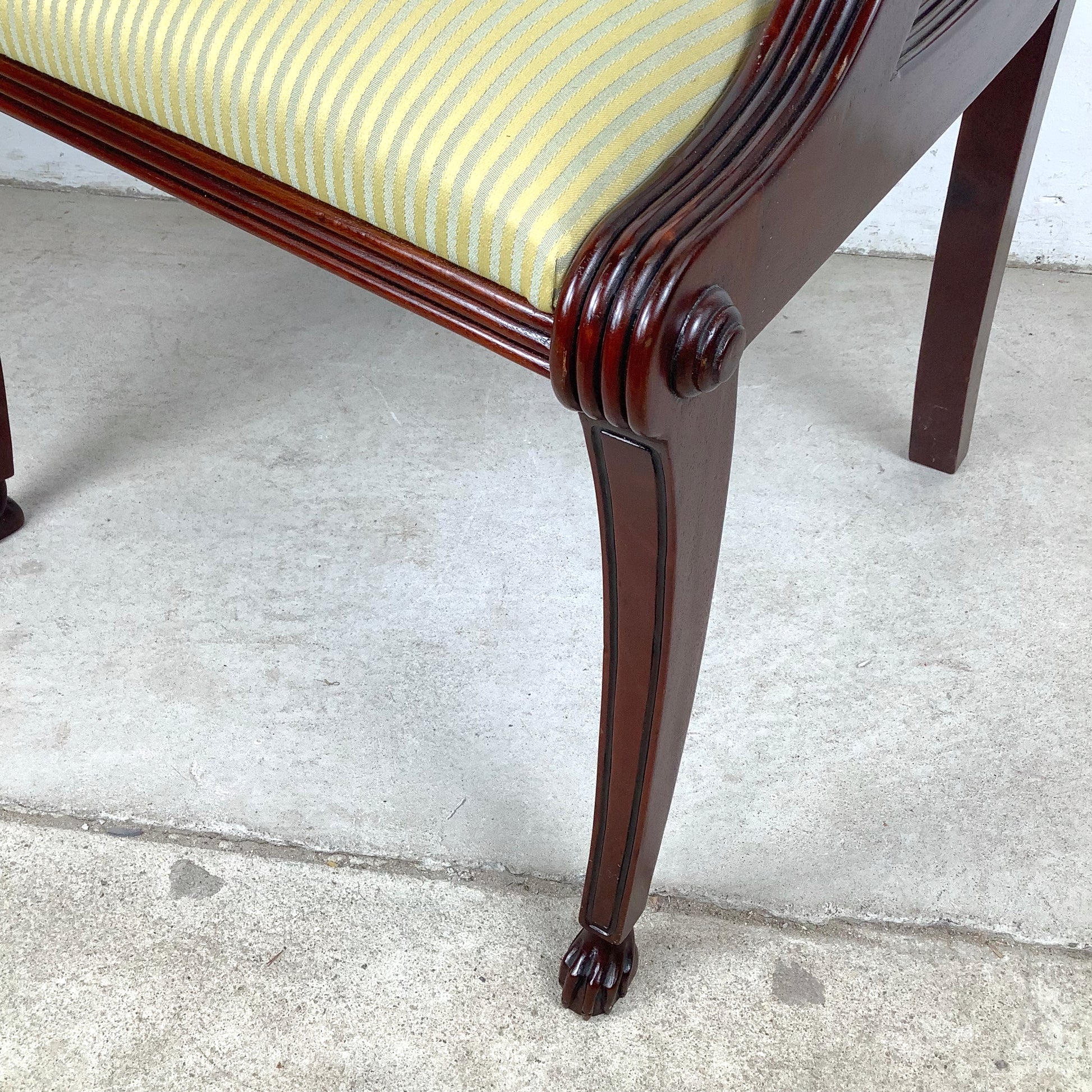 The mahogany frame has a rich finish that enhances the flowing lines of the arms and legs. Fluted carvings add detail without overwhelming the design, and the chair’s graceful stance makes it a versatile addition to both formal and casual spaces. Its warm wood tones pair effortlessly with a wide range of furnishings and color palettes.