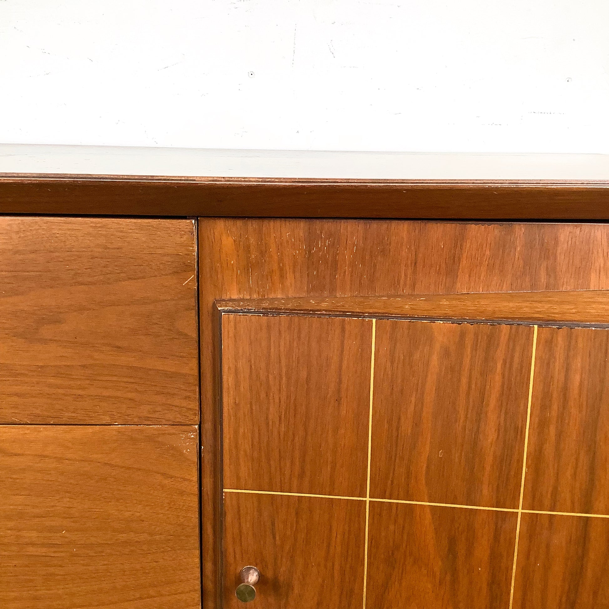 The walnut finish brings warmth and character, with visible grain adding subtle variation across the surfaces. Brass drawer pulls offer a refined contrast that enhances the overall aesthetic.