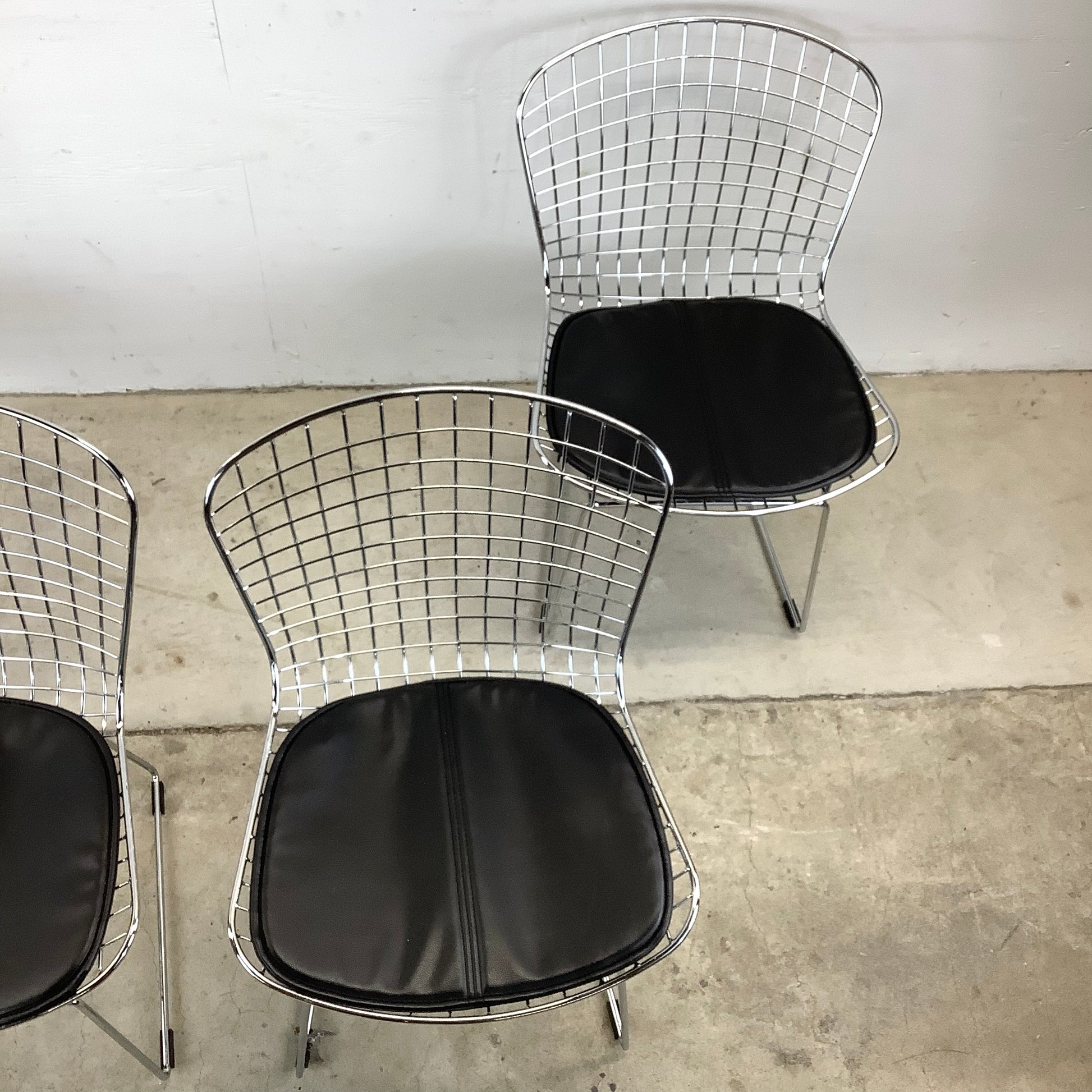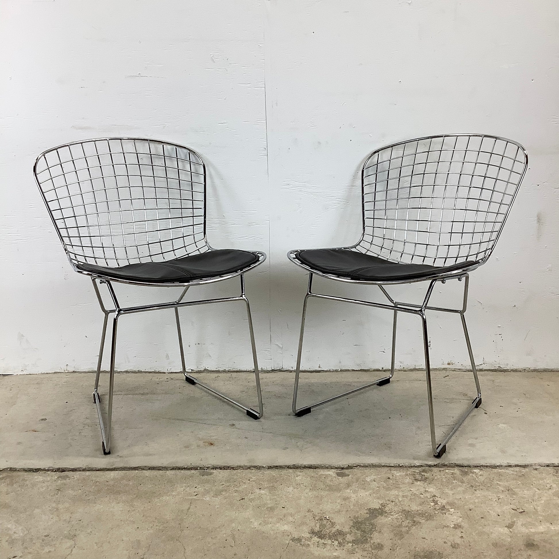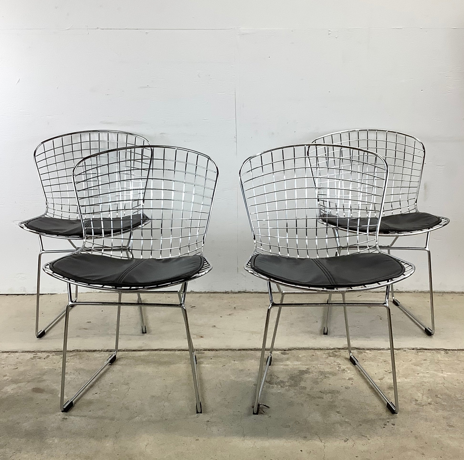 Surround your dining table with the sleek elegance of these modern reproduction wire frame chairs, inspired by the iconic designs of Harry Bertoia for Knoll. These chairs, with their airy silhouette and vintage charm, are a stylish homage to classic mid-century modern furniture.