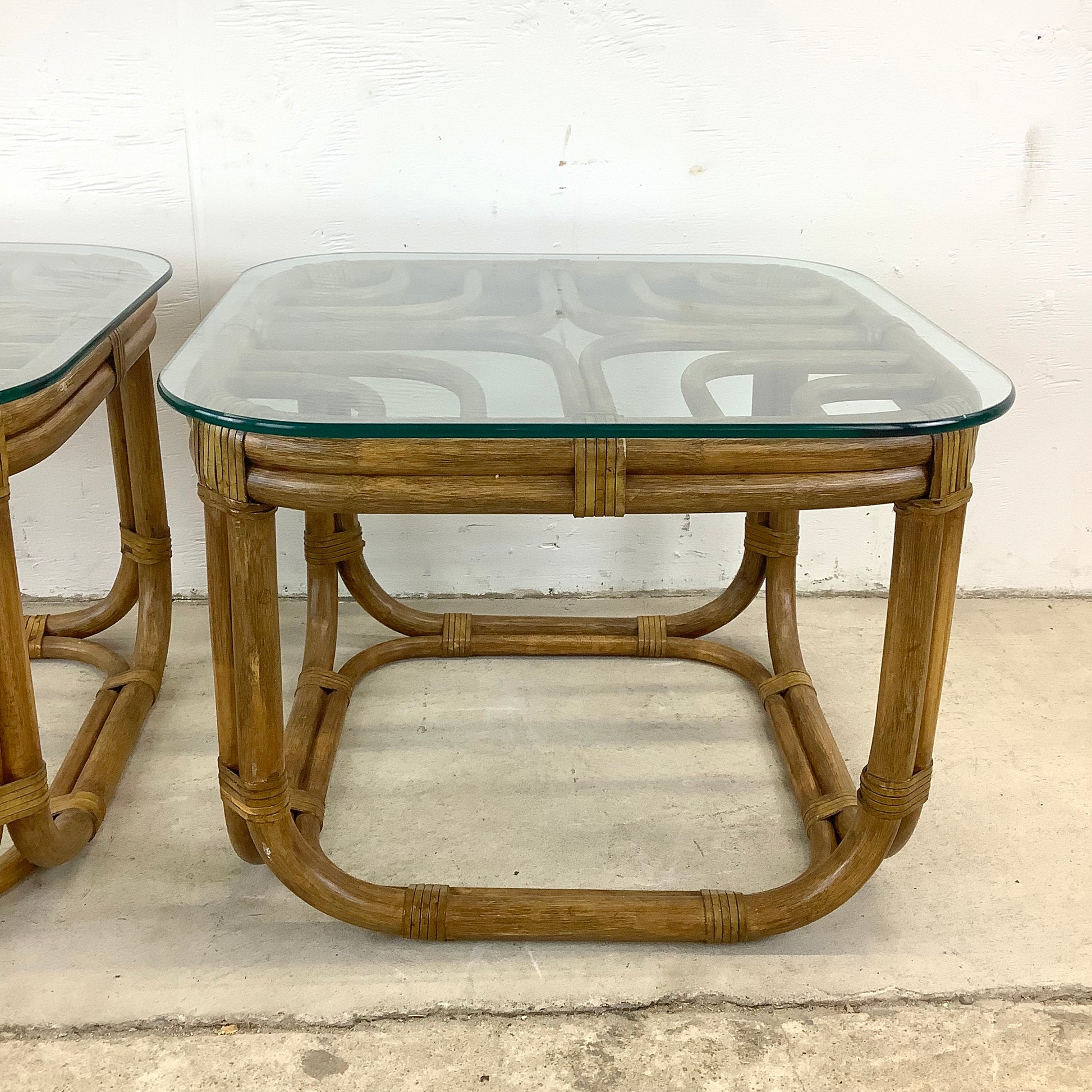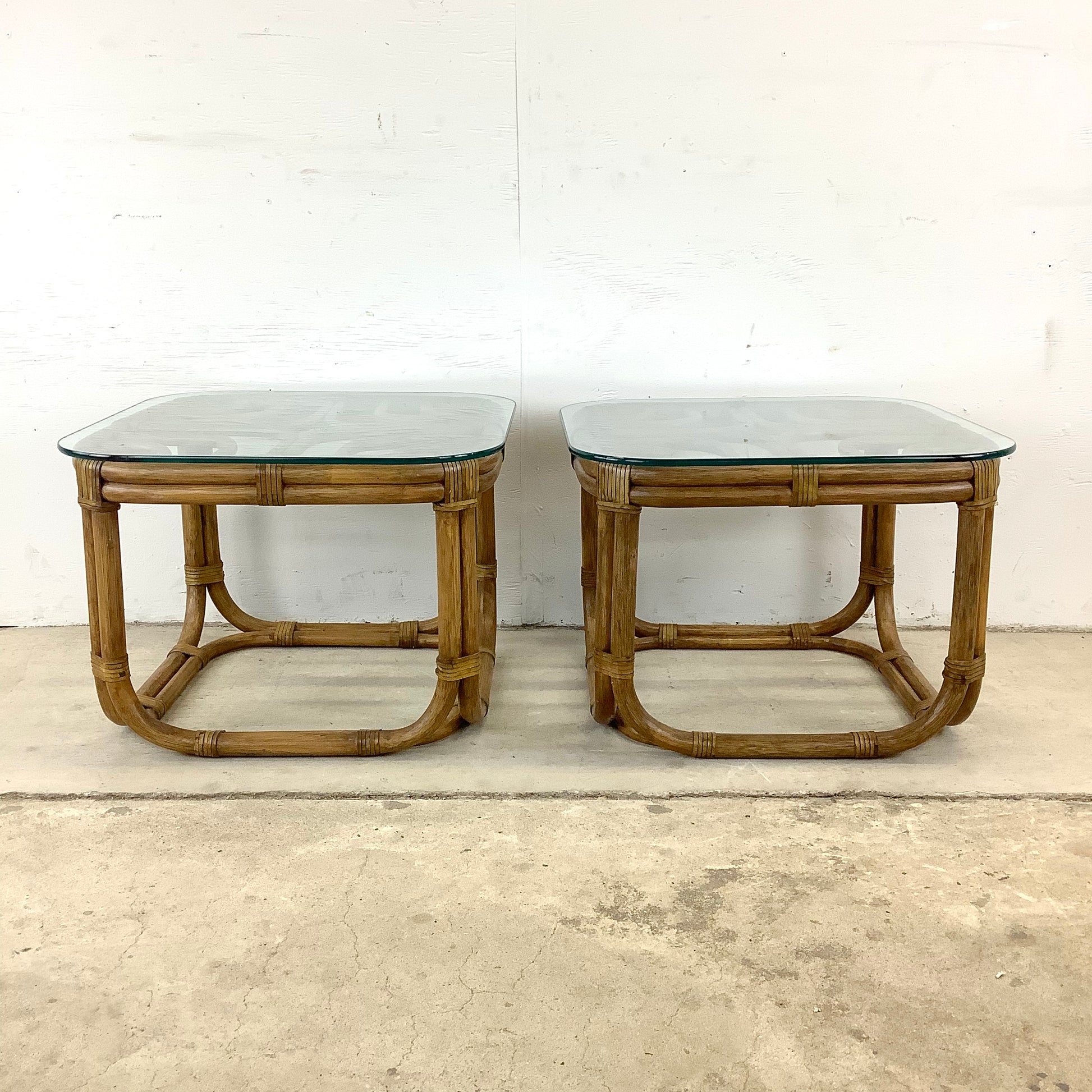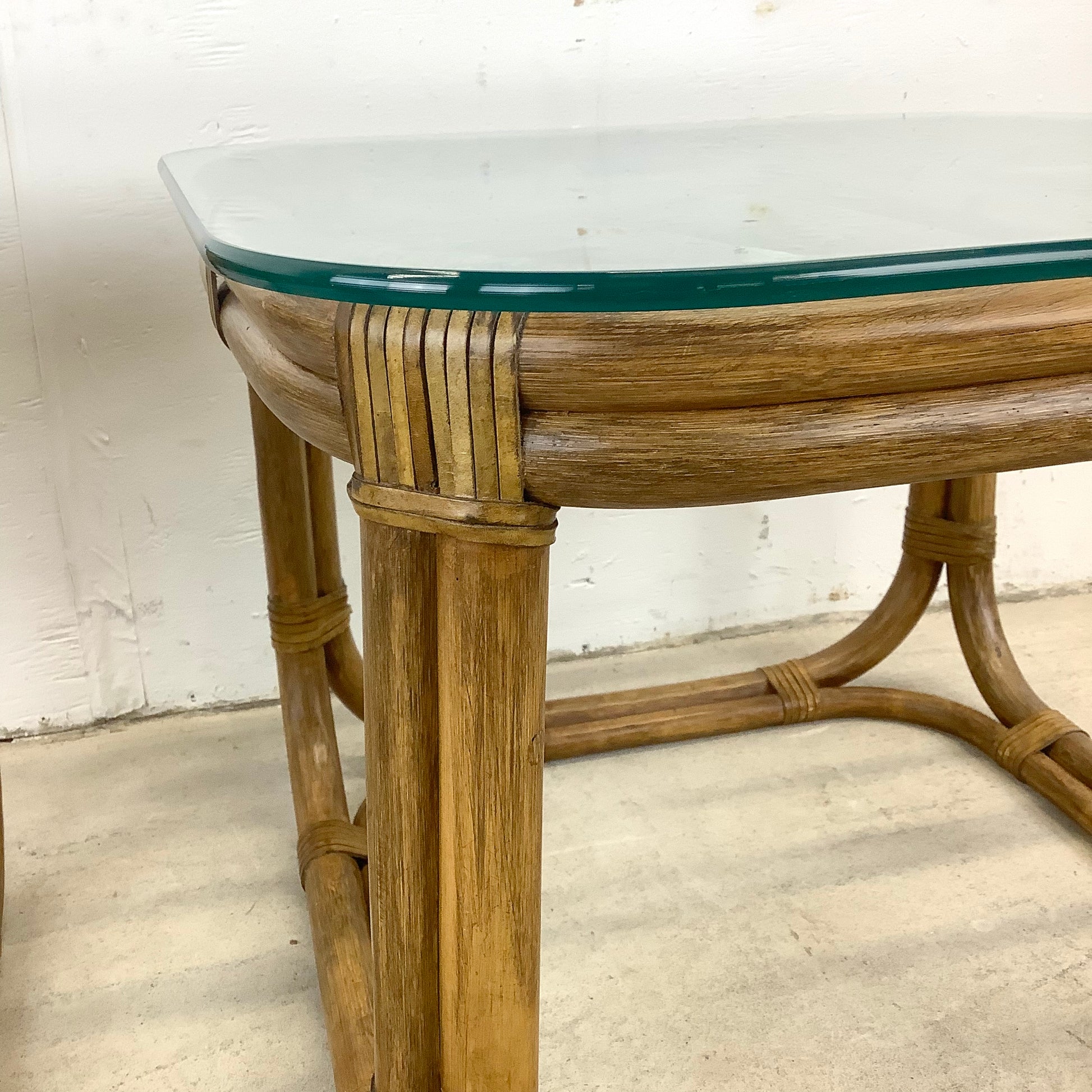 The design of these matching lamp tables tables reflects the iconic Brown Jordan aesthetic, known for its graceful lines and enduring style. The natural beauty of the rattan is showcased in the intricate weaving and sturdy construction, while the glass tops provide a smooth, durable surface ideal for displaying your favorite decorative items or holding a cup of coffee.