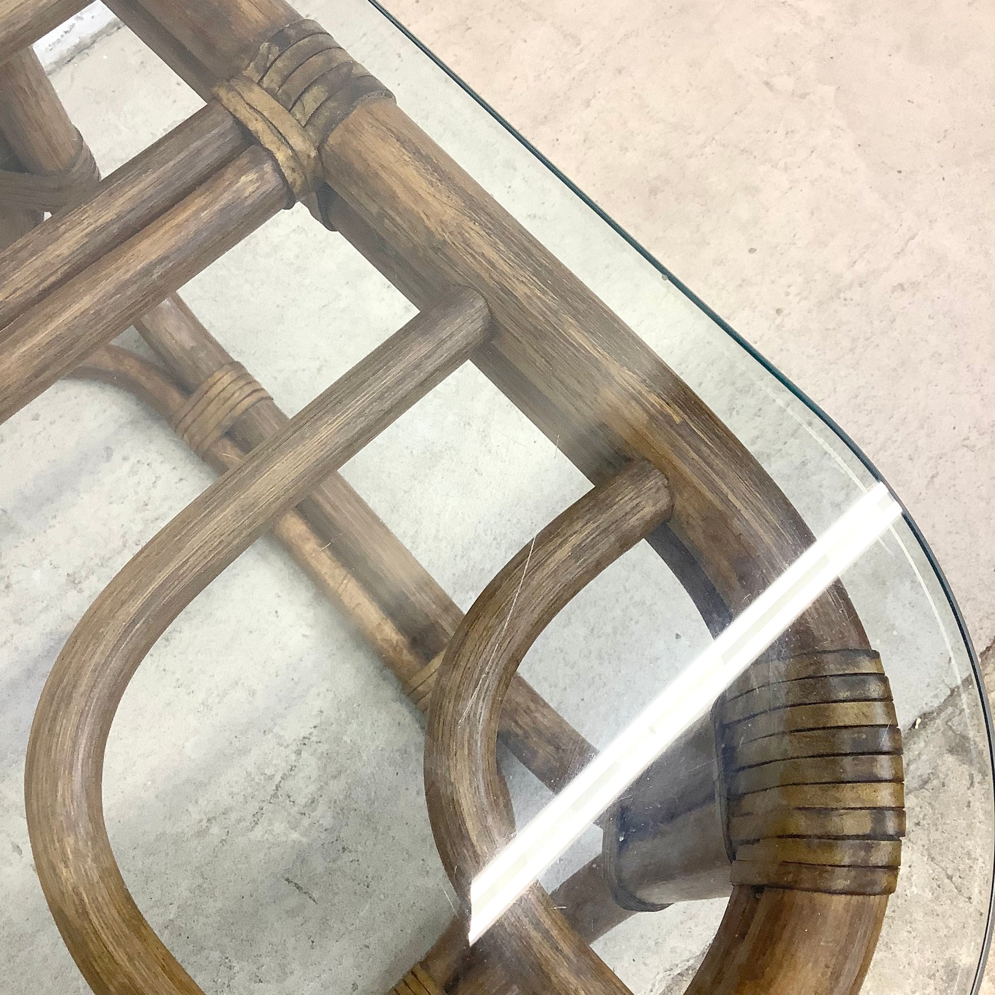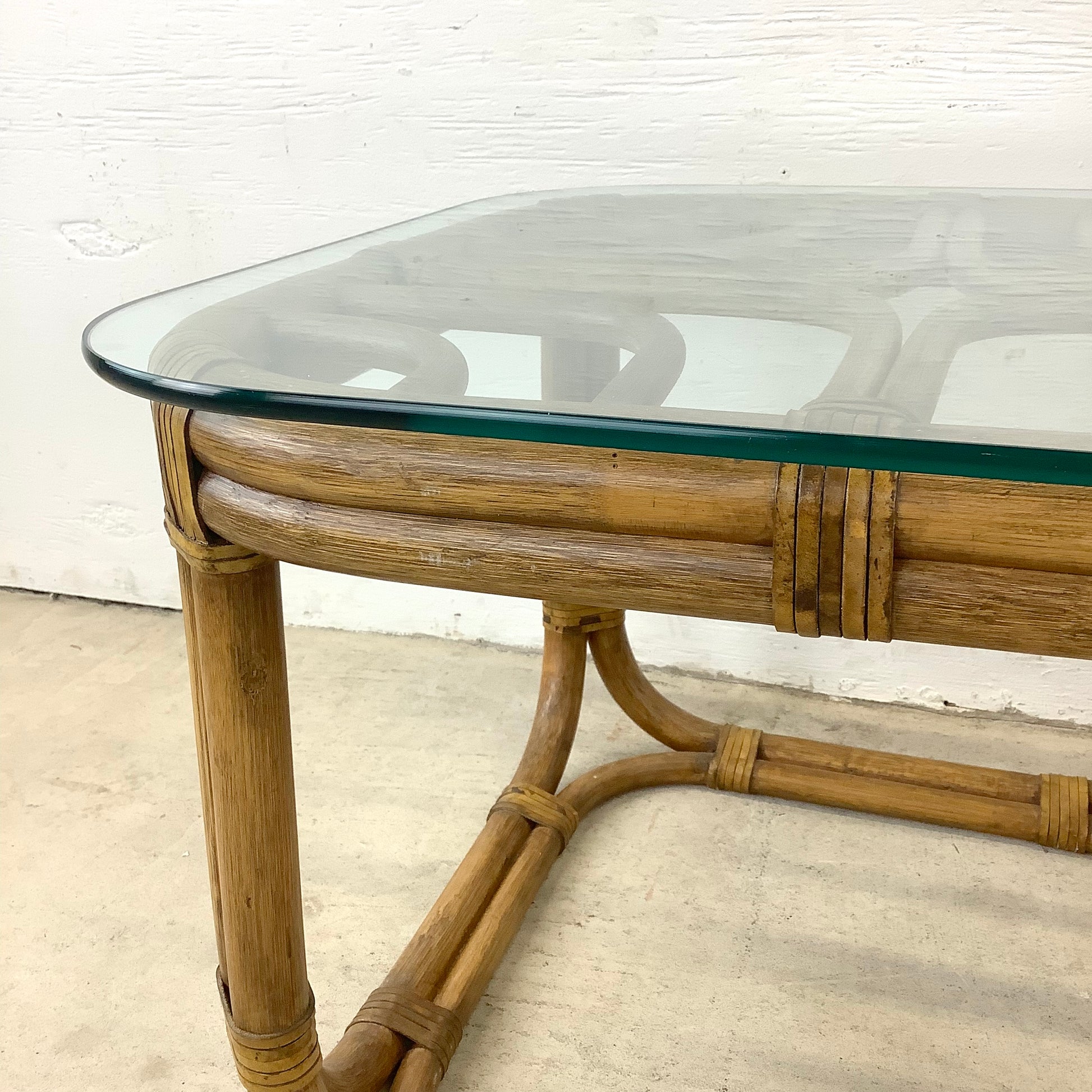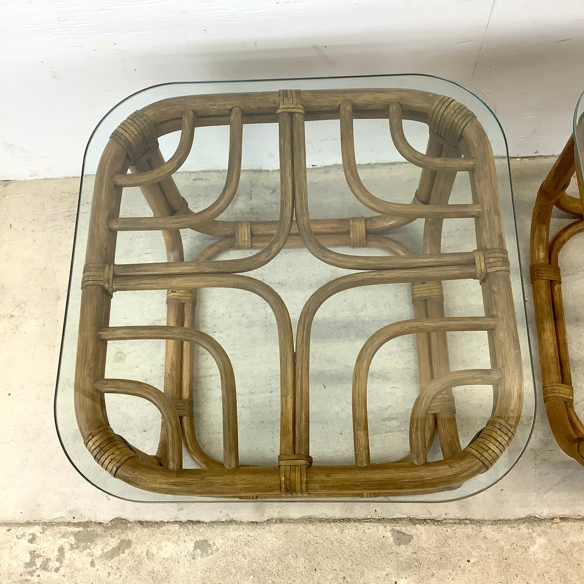 The design of these matching lamp tables tables reflects the iconic Brown Jordan aesthetic, known for its graceful lines and enduring style. The natural beauty of the rattan is showcased in the intricate weaving and sturdy construction, while the glass tops provide a smooth, durable surface ideal for displaying your favorite decorative items or holding a cup of coffee.