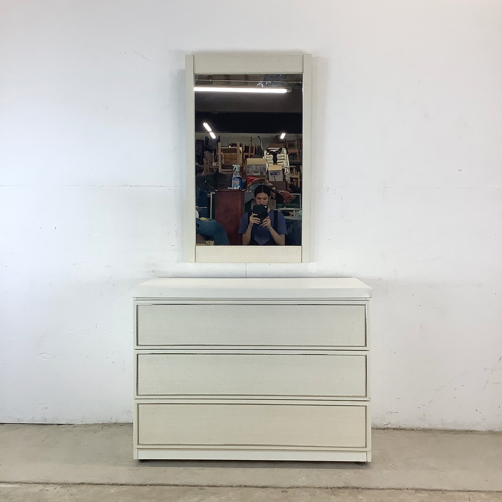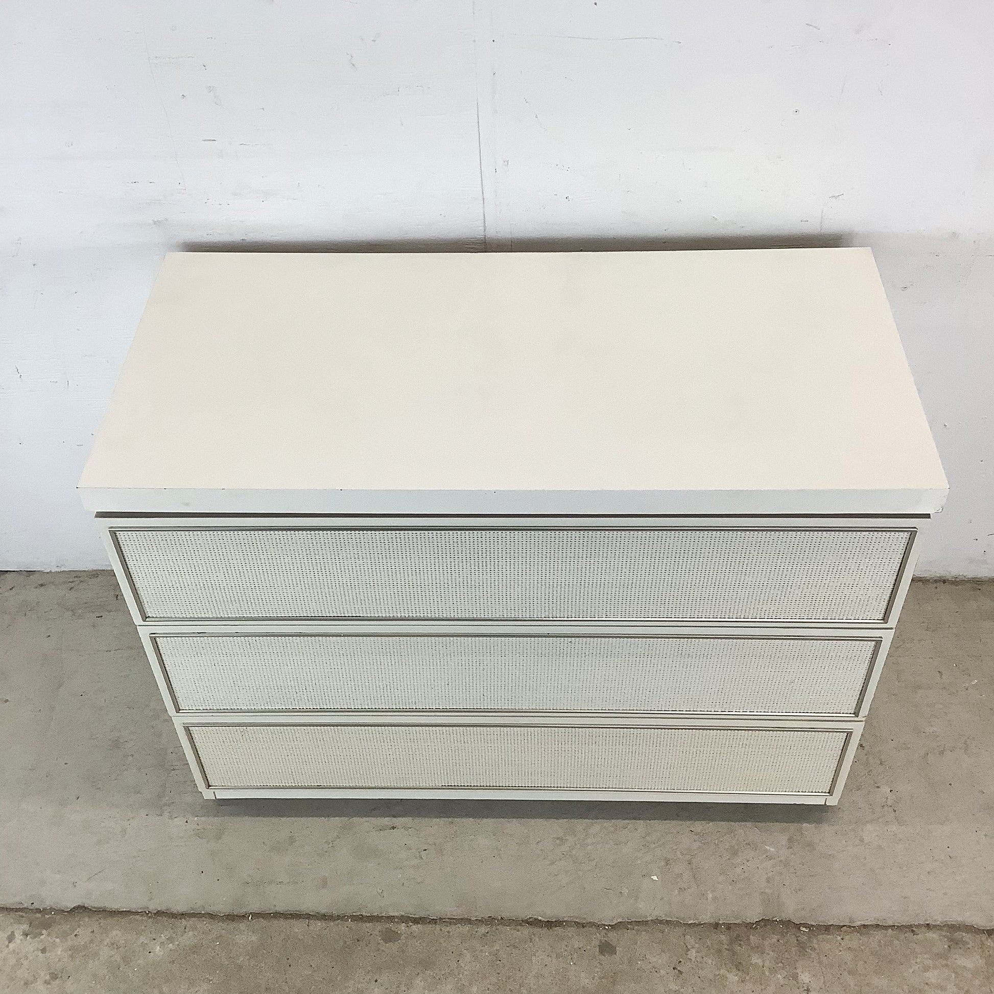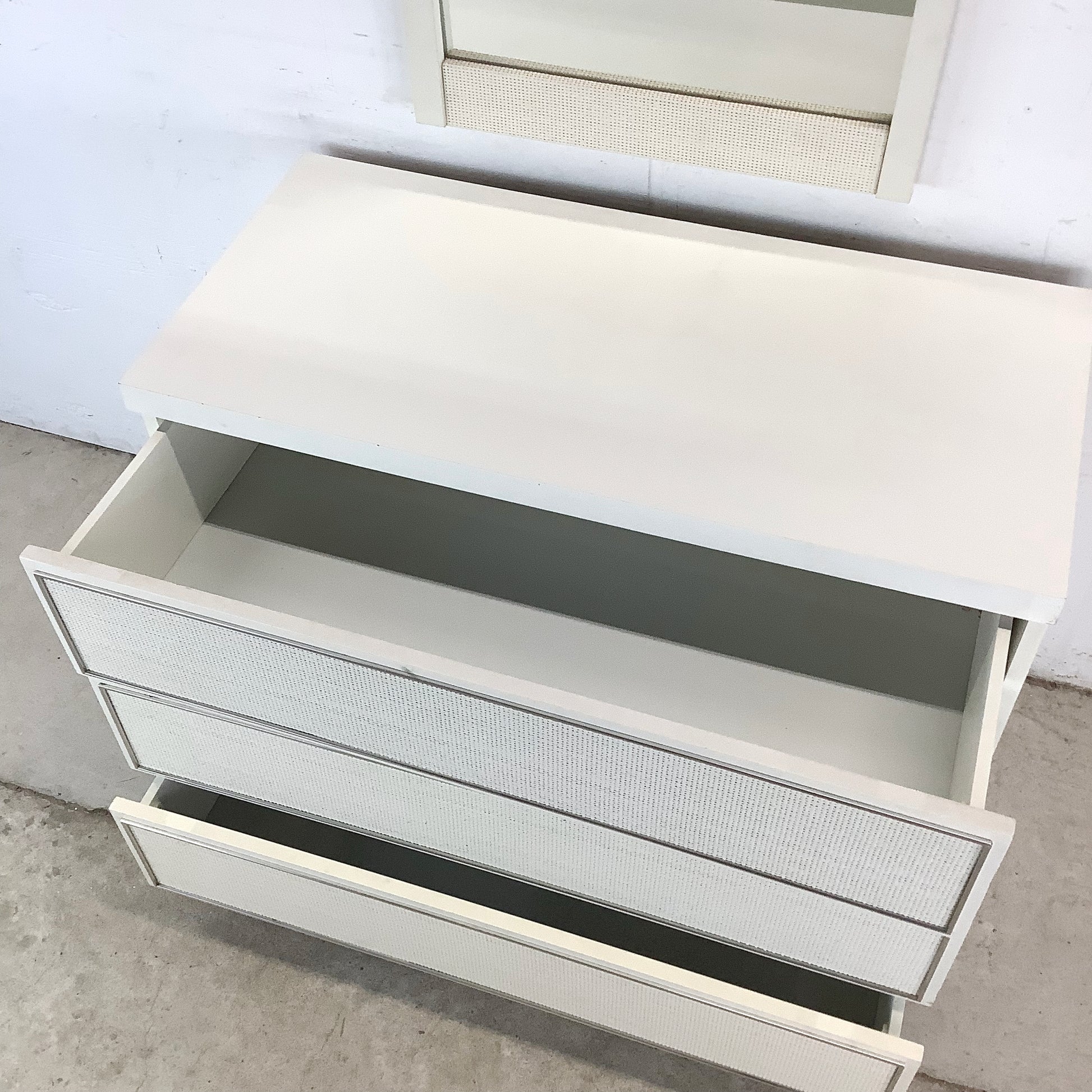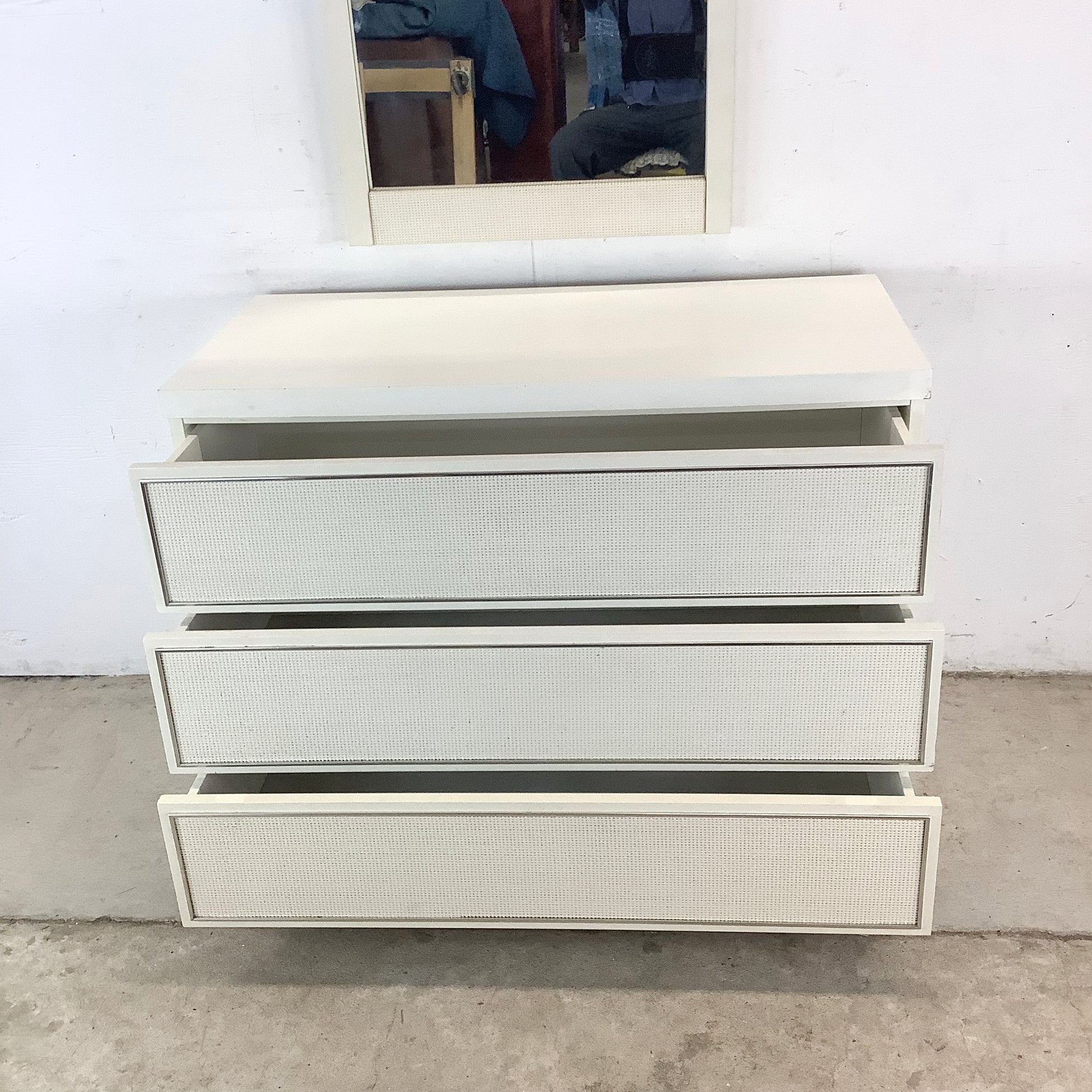 This vintage three-drawer chest brings a unique mix of texture, contrast, and classic design. Finished in a crisp white lacquer, the piece features painted cane-front drawers framed in metallic trim, blending organic detailing with geometric precision. A matching wall mirror, included with the chest, completes this refined two-piece set.