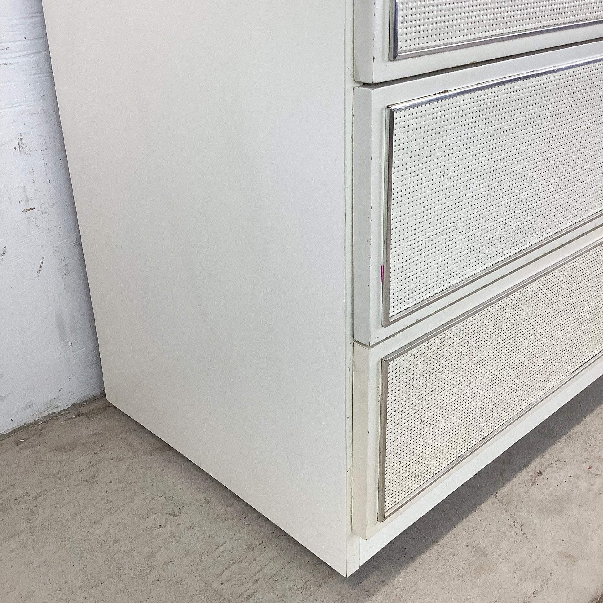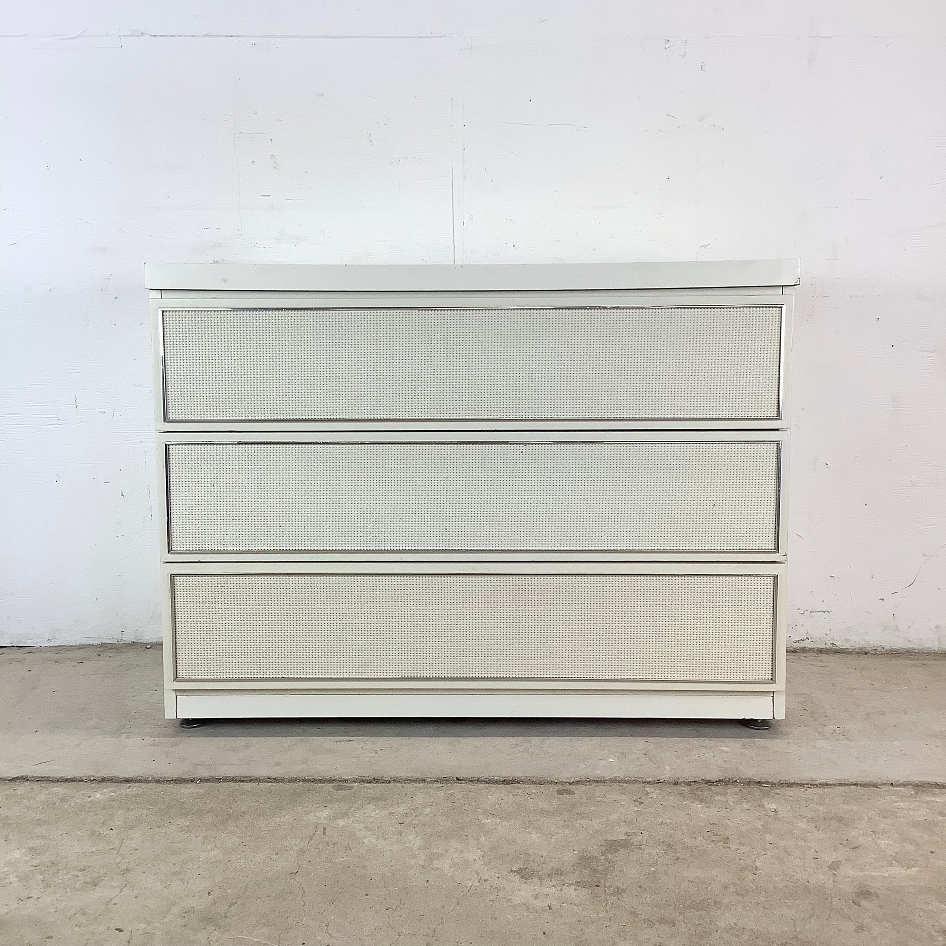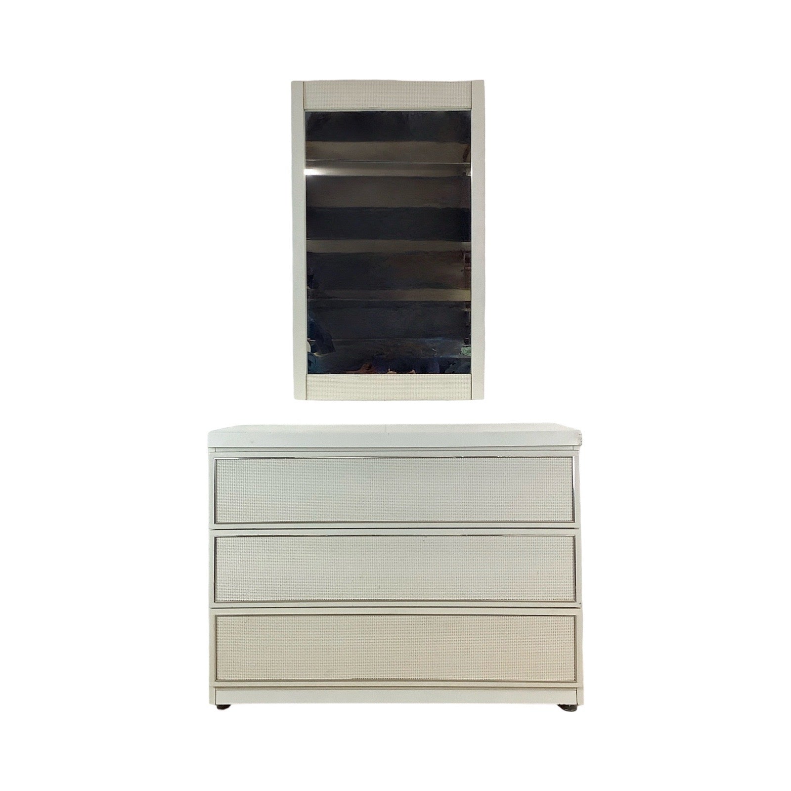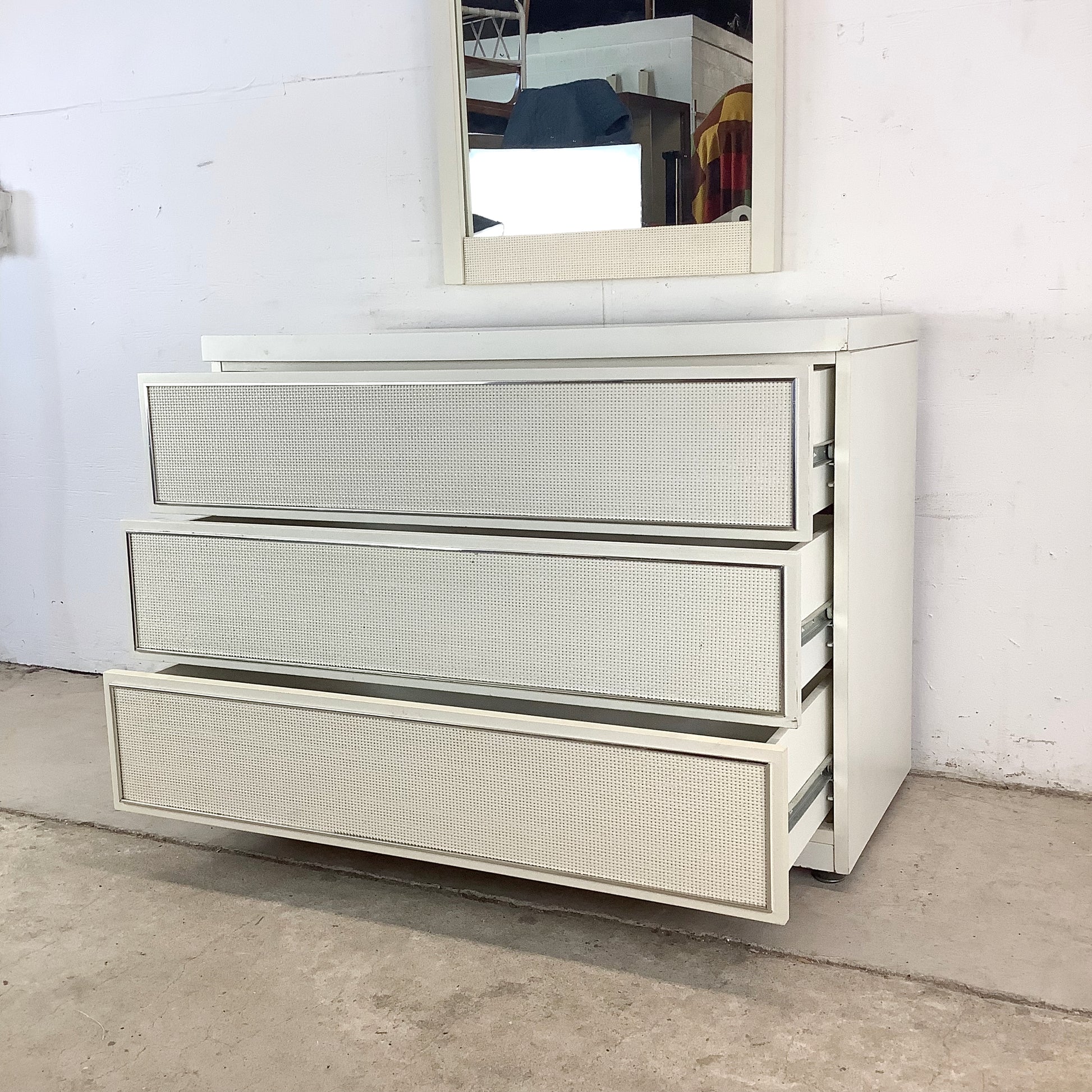 This vintage three-drawer chest brings a unique mix of texture, contrast, and classic design. Finished in a crisp white lacquer, the piece features painted cane-front drawers framed in metallic trim, blending organic detailing with geometric precision. A matching wall mirror, included with the chest, completes this refined two-piece set.