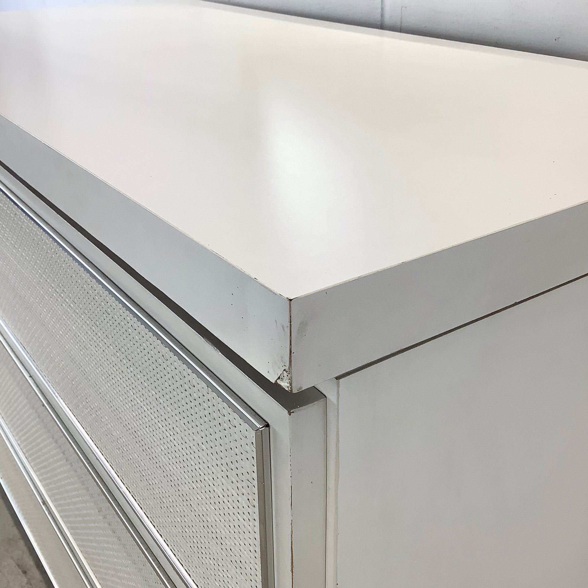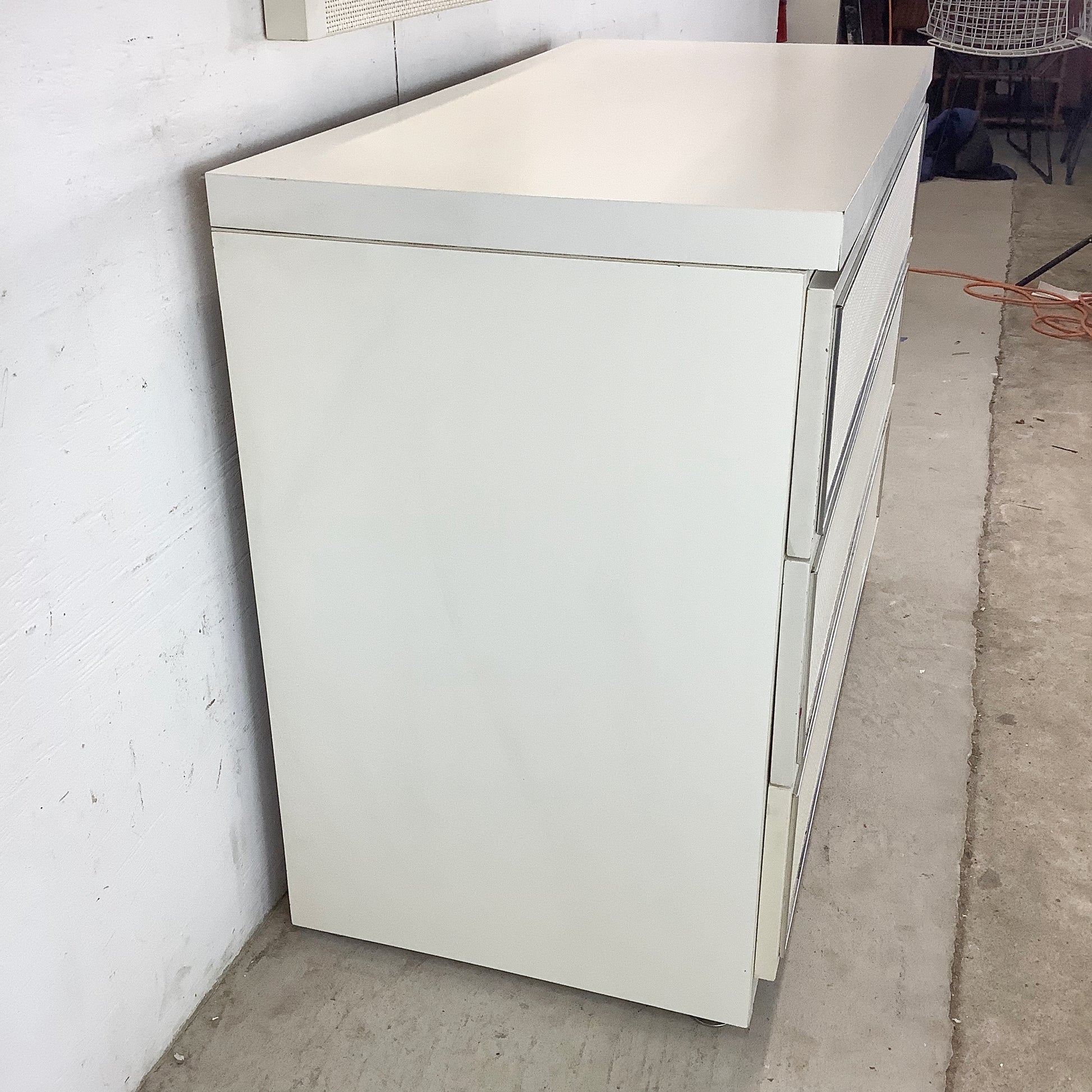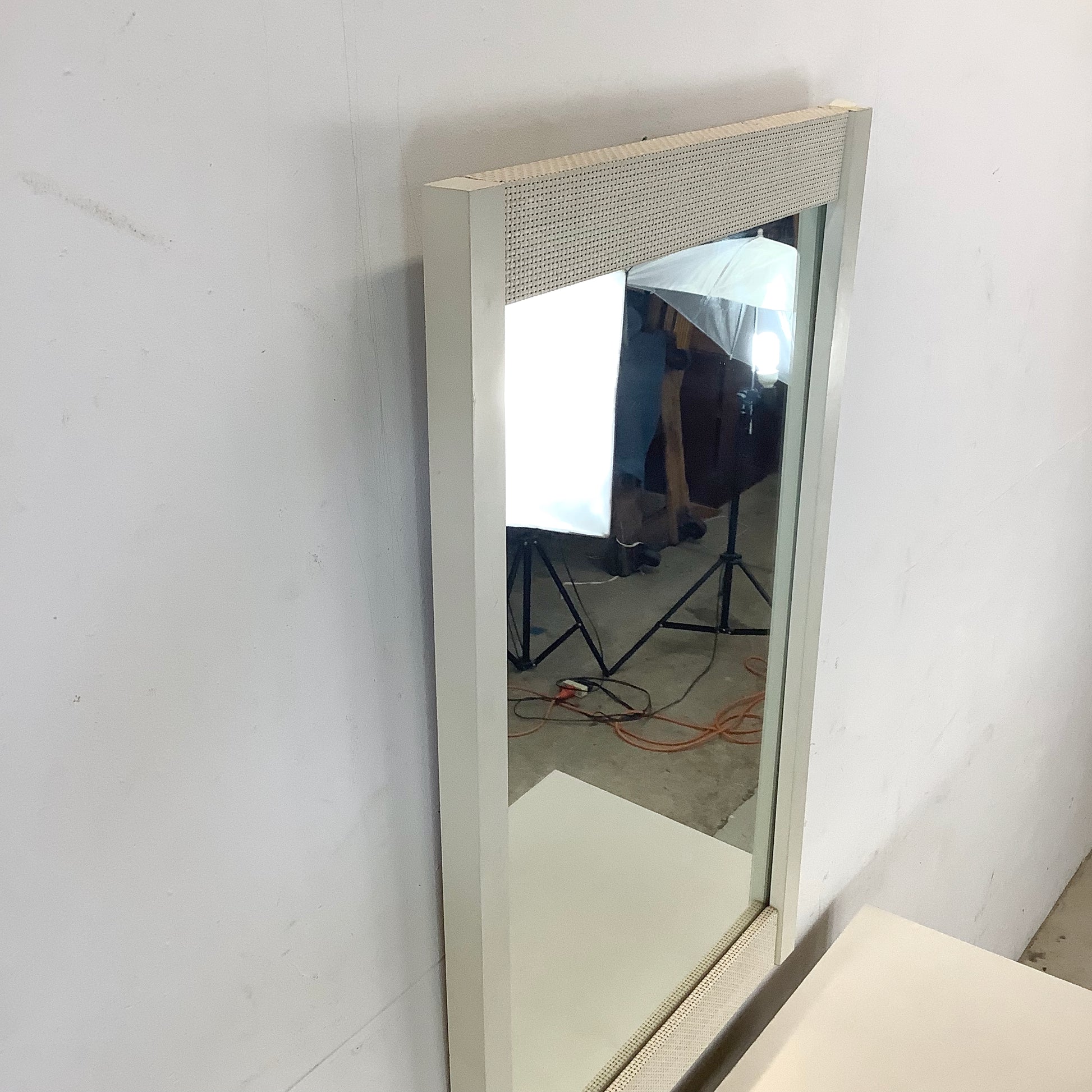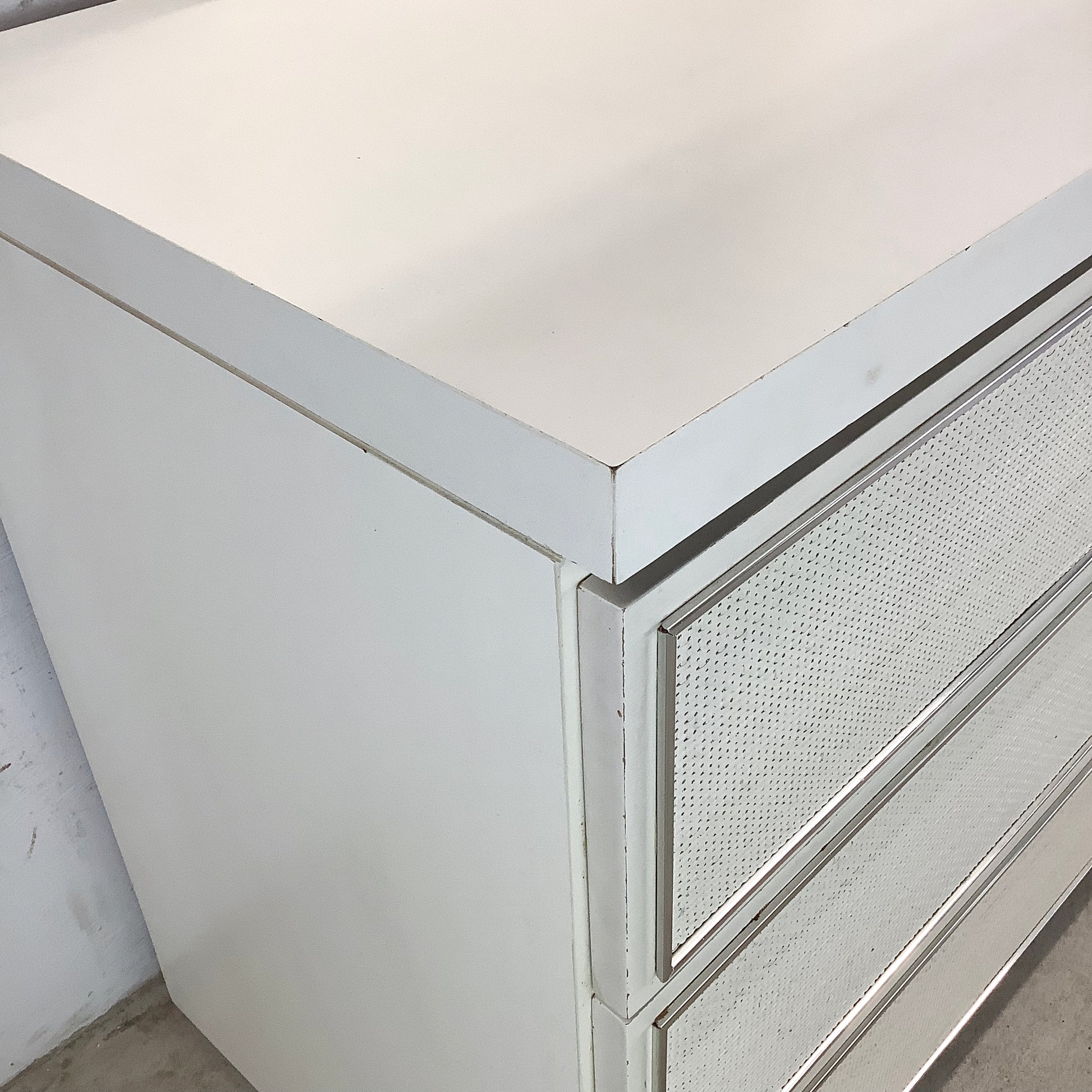 This vintage three-drawer chest brings a unique mix of texture, contrast, and classic design. Finished in a crisp white lacquer, the piece features painted cane-front drawers framed in metallic trim, blending organic detailing with geometric precision. A matching wall mirror, included with the chest, completes this refined two-piece set.