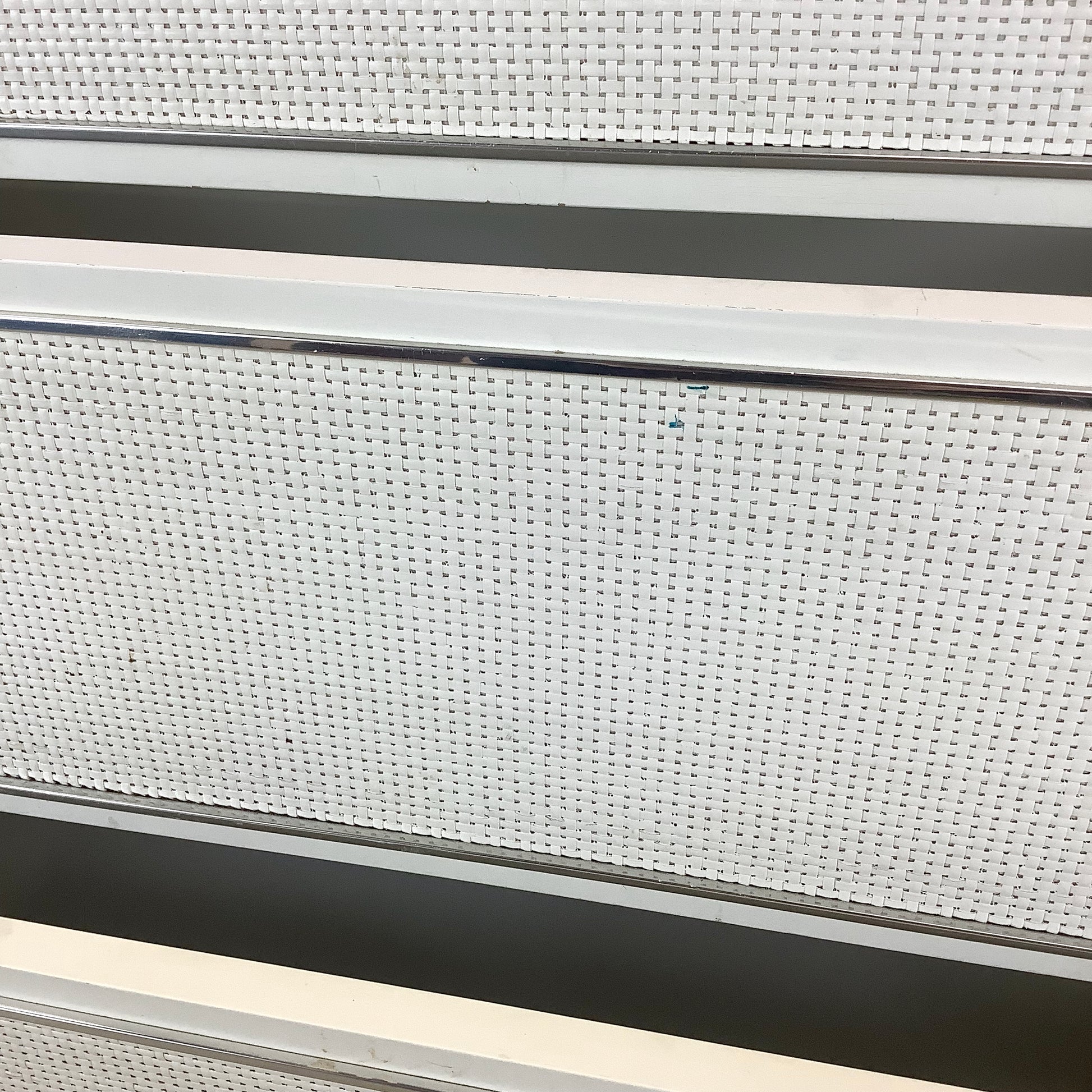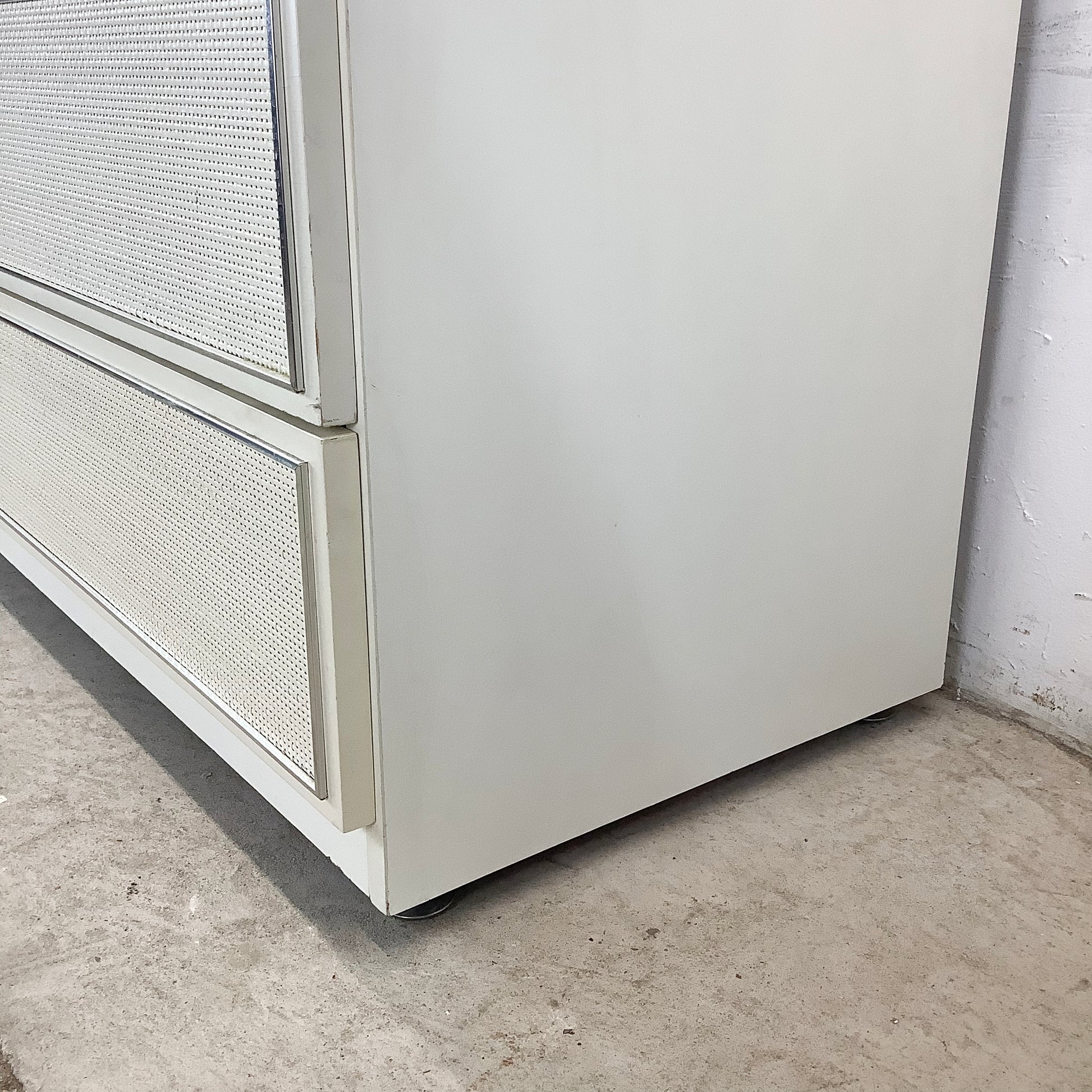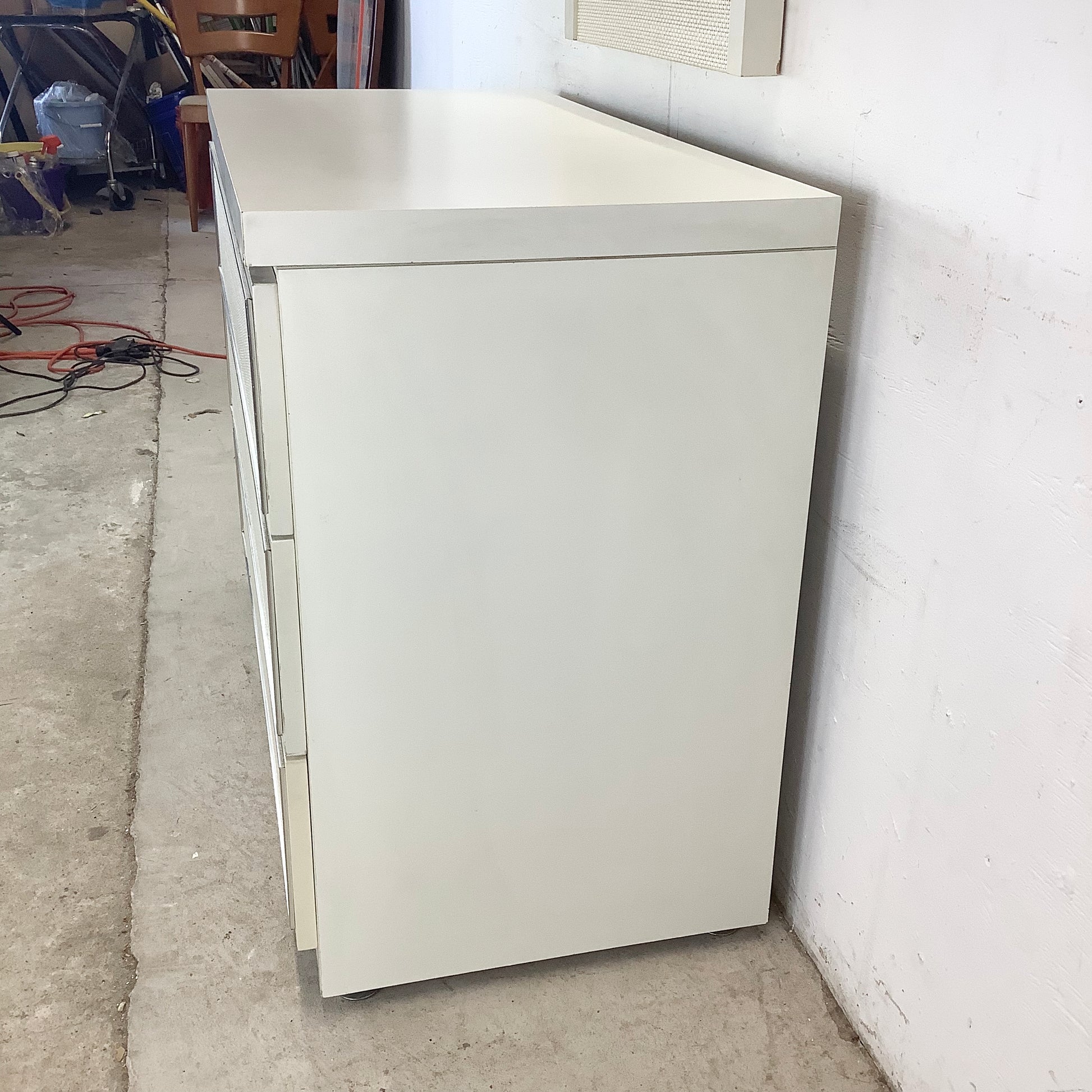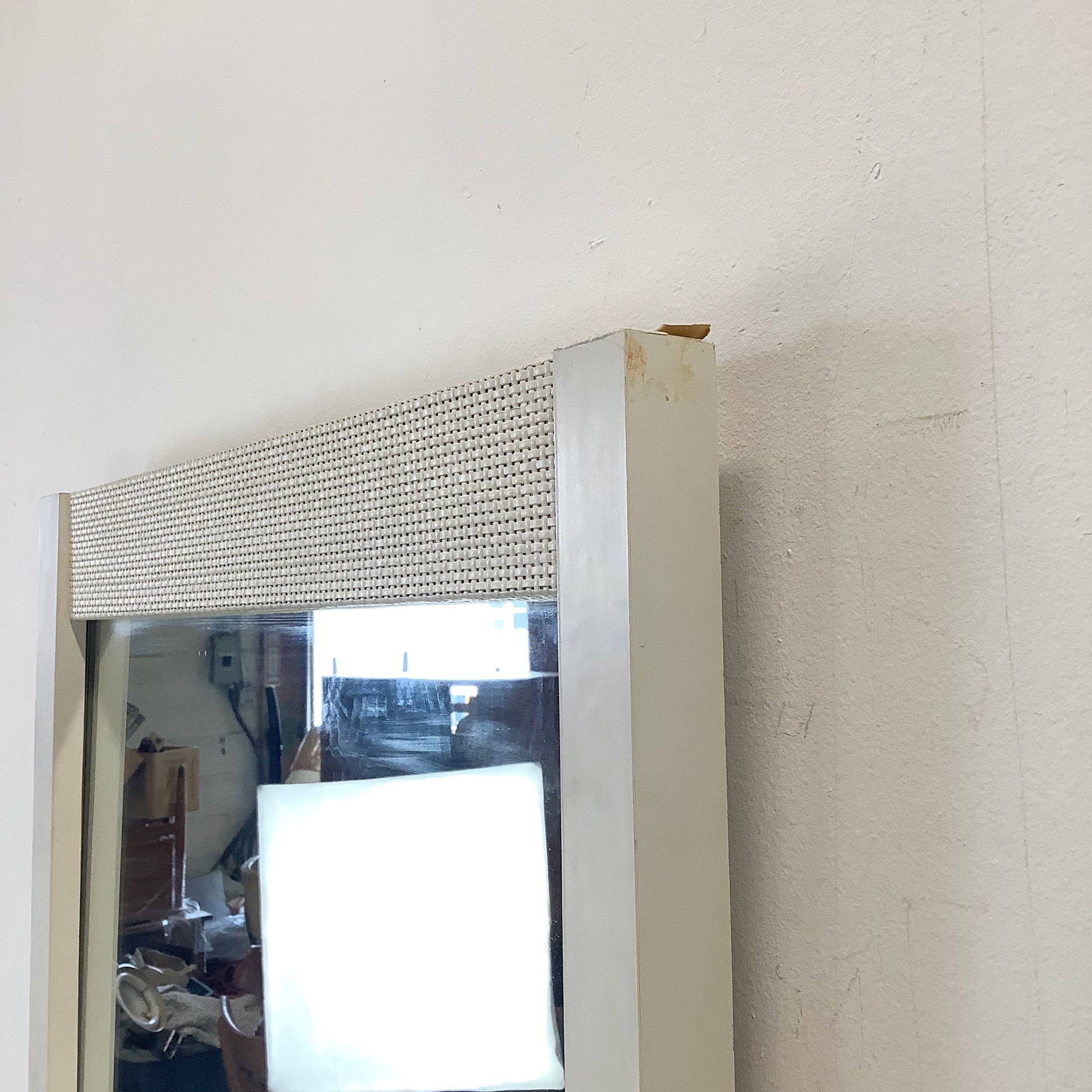 This vintage three-drawer chest brings a unique mix of texture, contrast, and classic design. Finished in a crisp white lacquer, the piece features painted cane-front drawers framed in metallic trim, blending organic detailing with geometric precision. A matching wall mirror, included with the chest, completes this refined two-piece set.