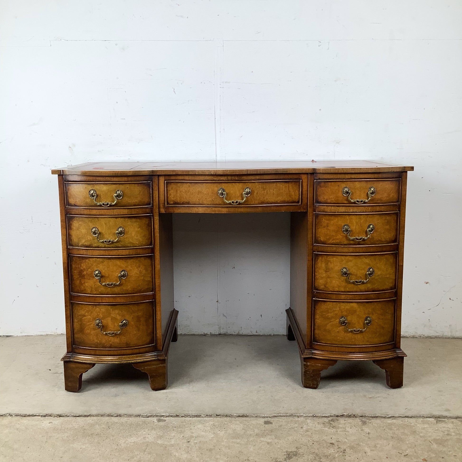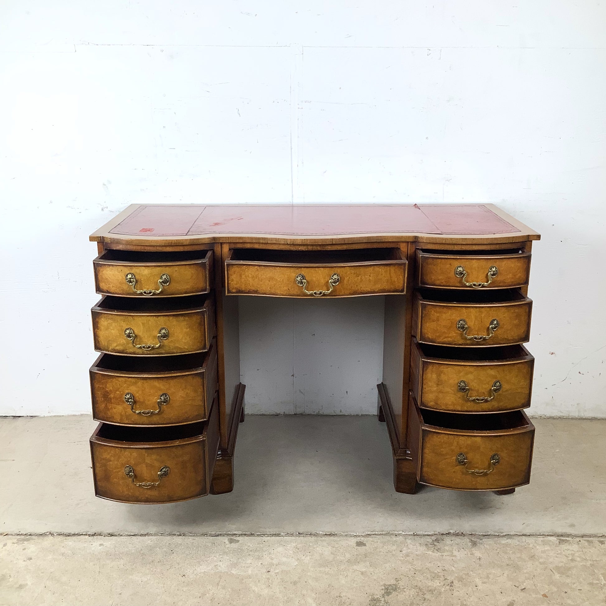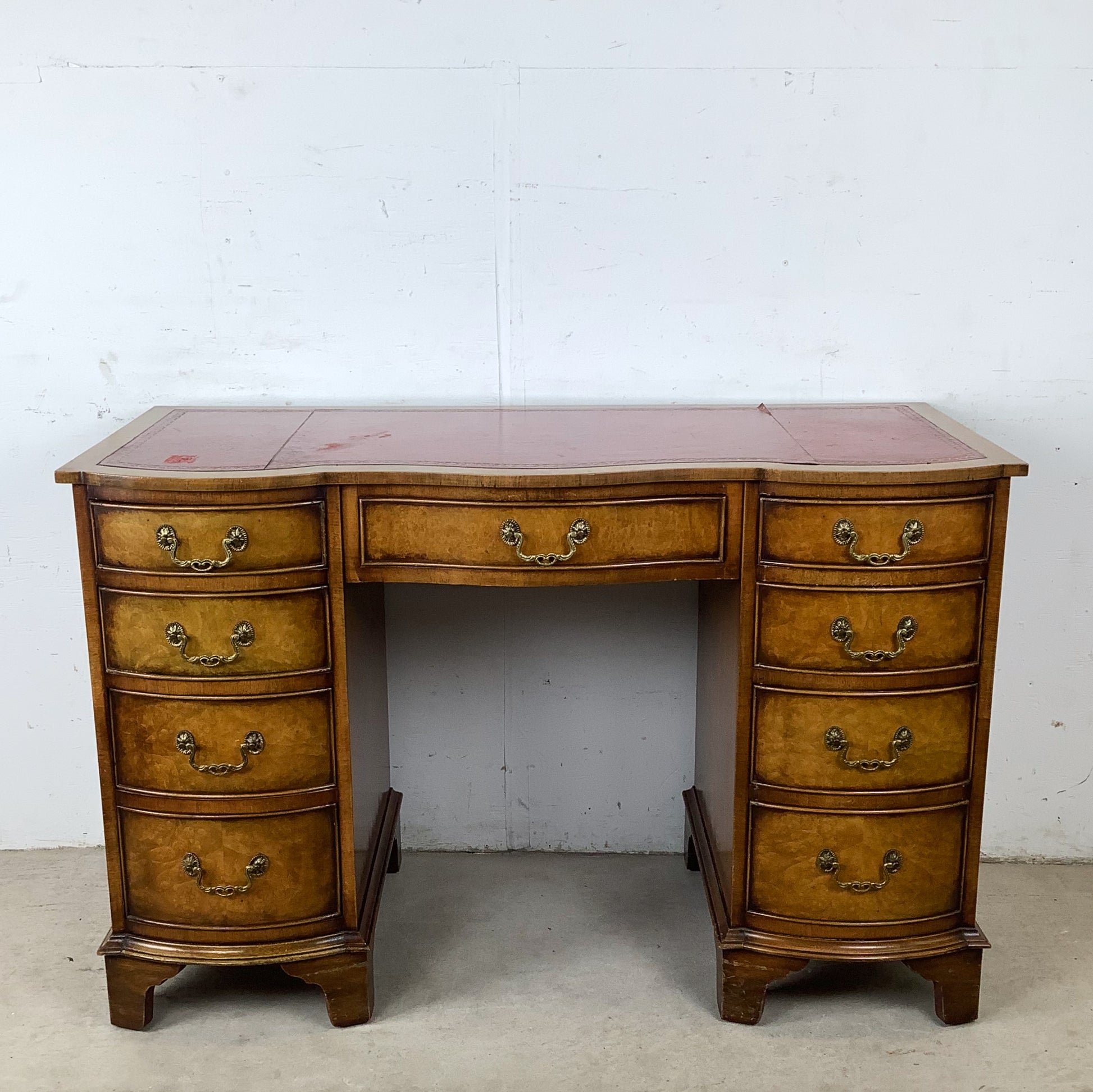 The inset red leather top features decorative gilt tooling and a rich, warm tone. Wear to the leather—including areas of loss and separation—is present and has been left unaltered, preserving the desk’s vintage character.