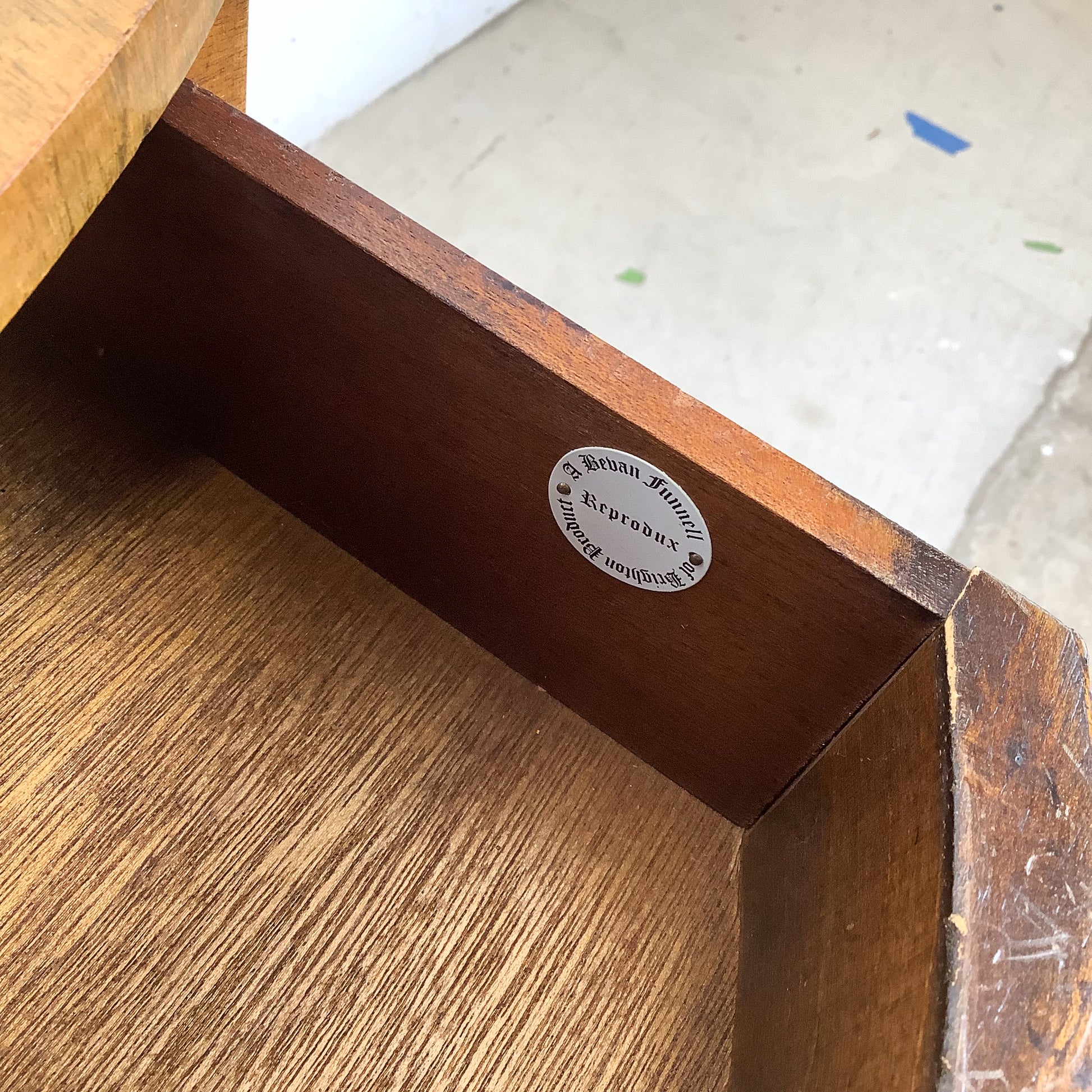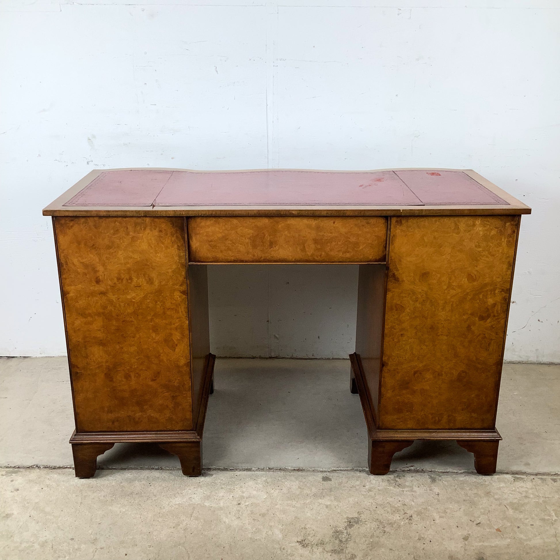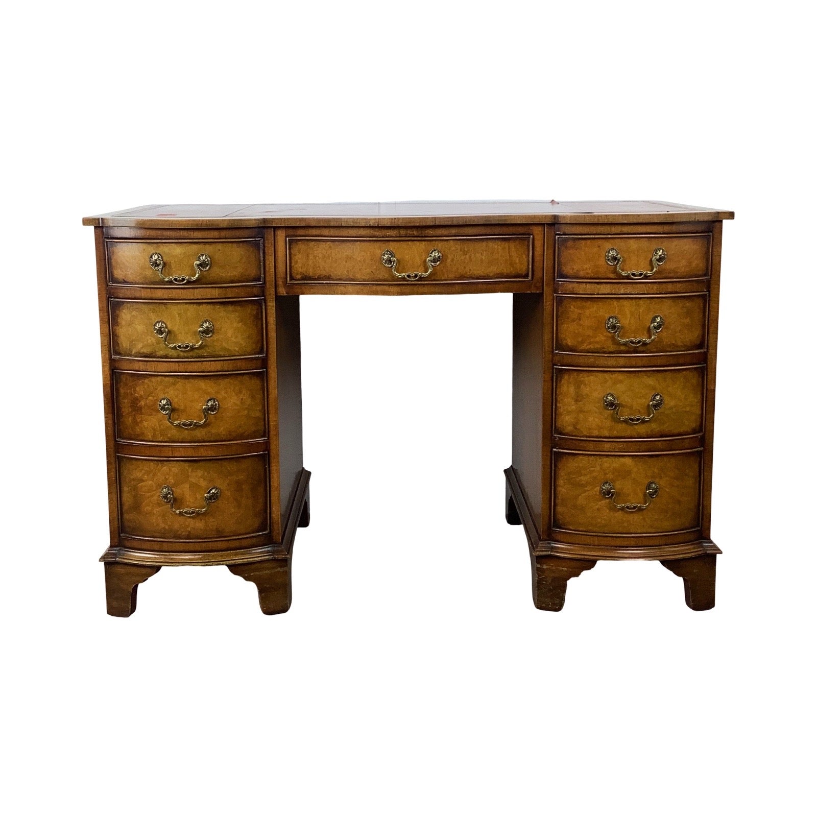 The inset red leather top features decorative gilt tooling and a rich, warm tone. Wear to the leather—including areas of loss and separation—is present and has been left unaltered, preserving the desk’s vintage character.