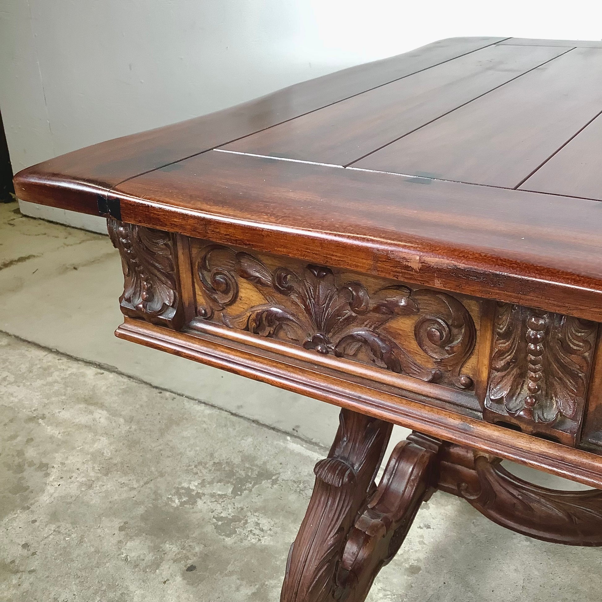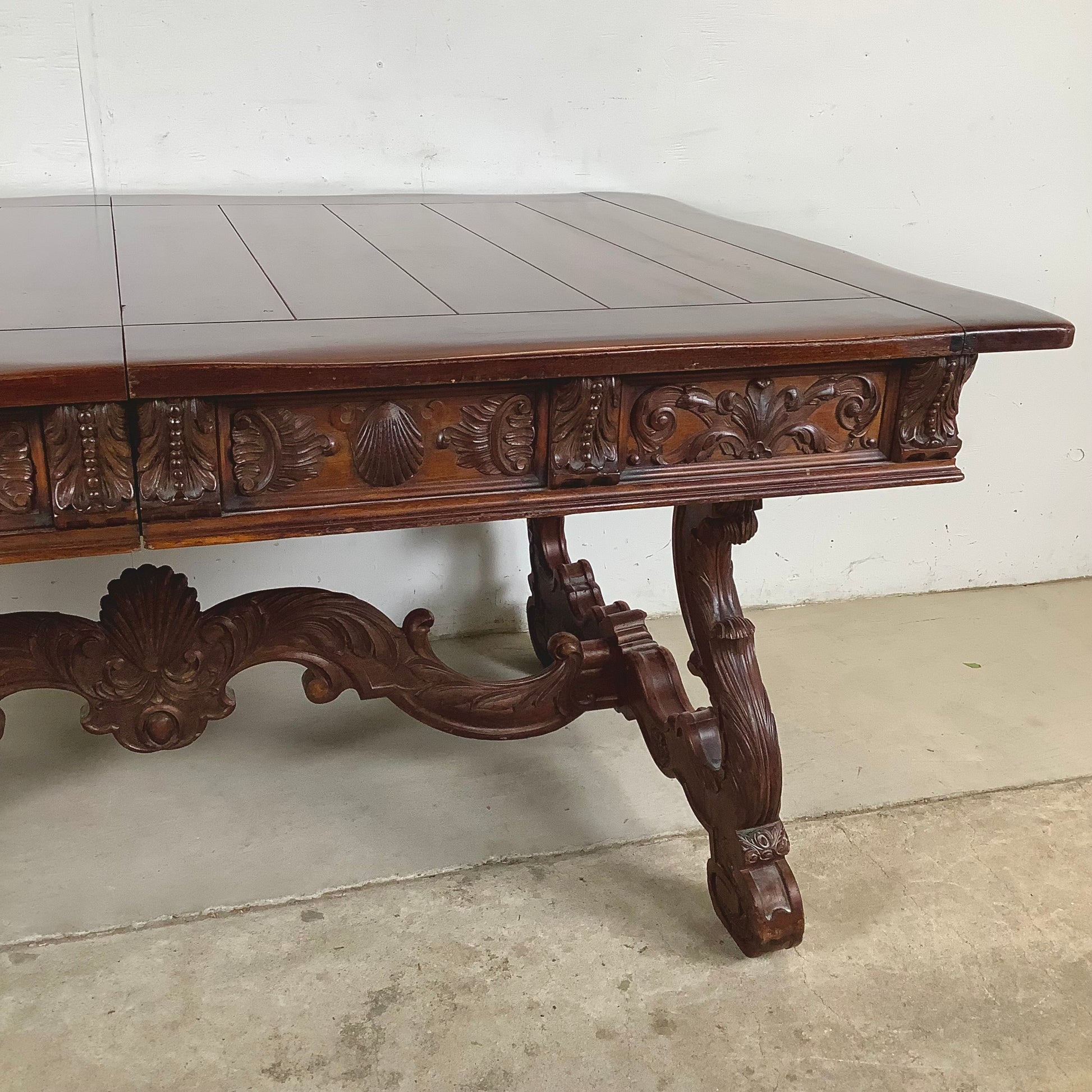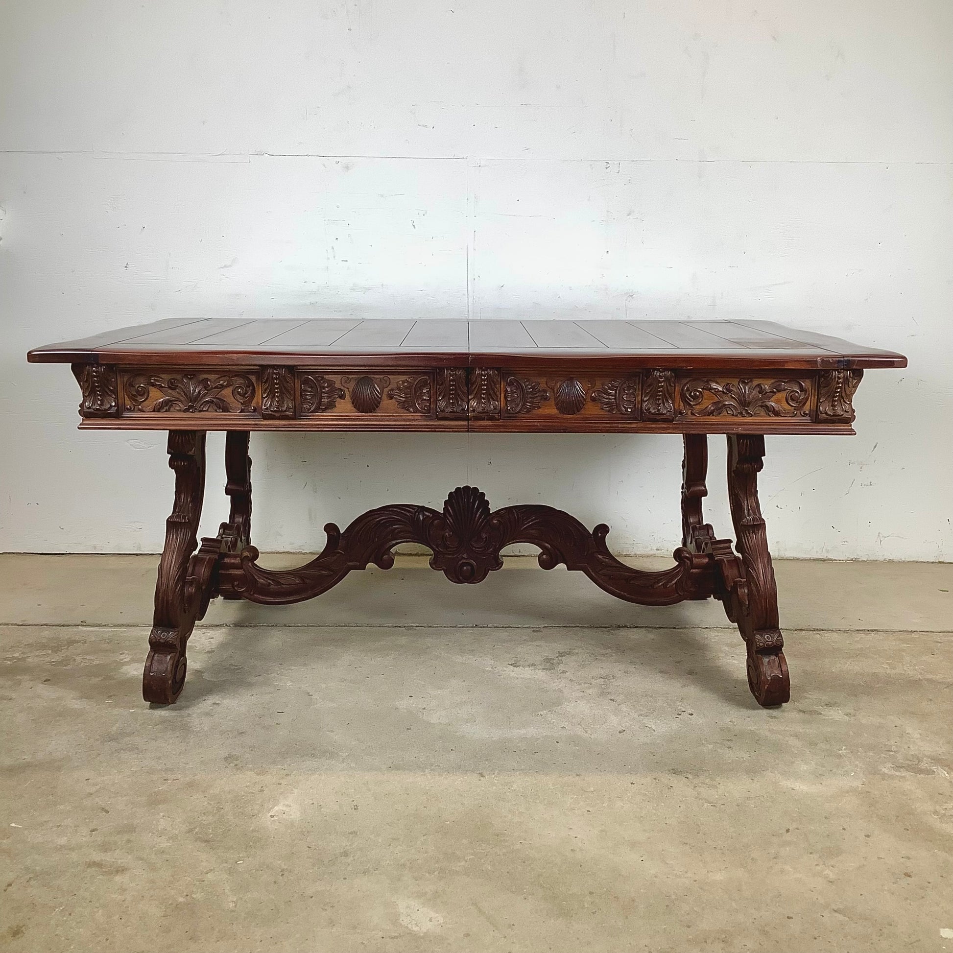The apron features deeply carved shell and foliage motifs, lending the piece a sense of Old World craftsmanship rooted in Spanish Renaissance aesthetics. These elements provide visual interest while remaining cohesive with the table’s overall architecture.