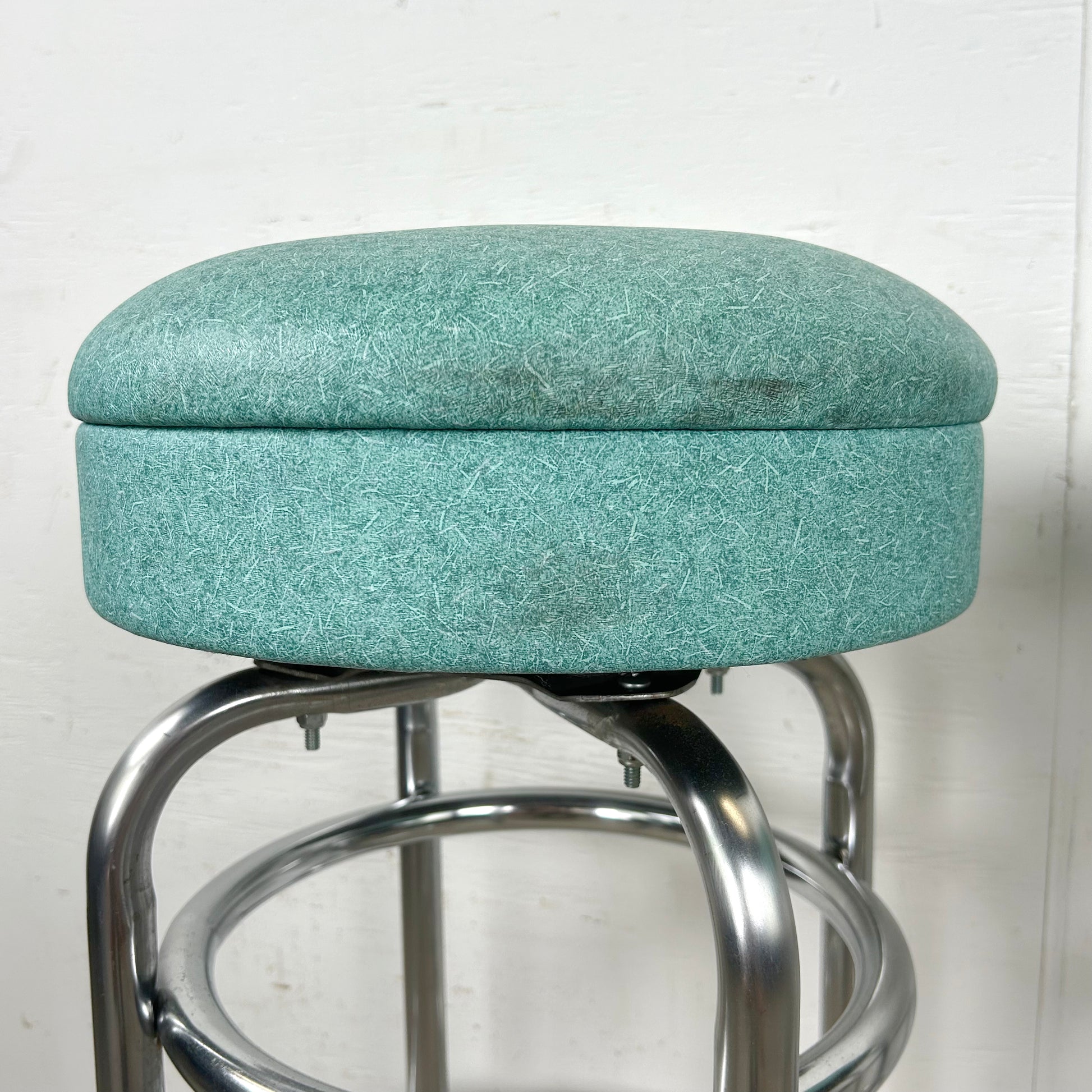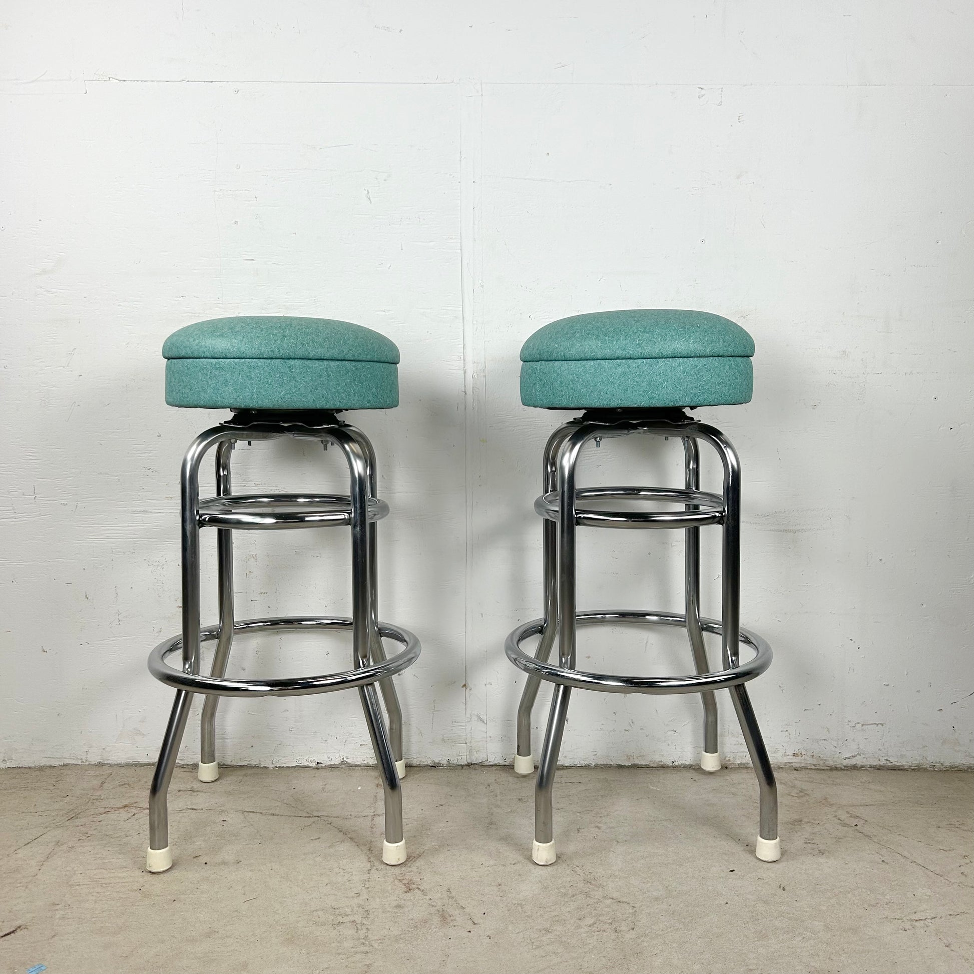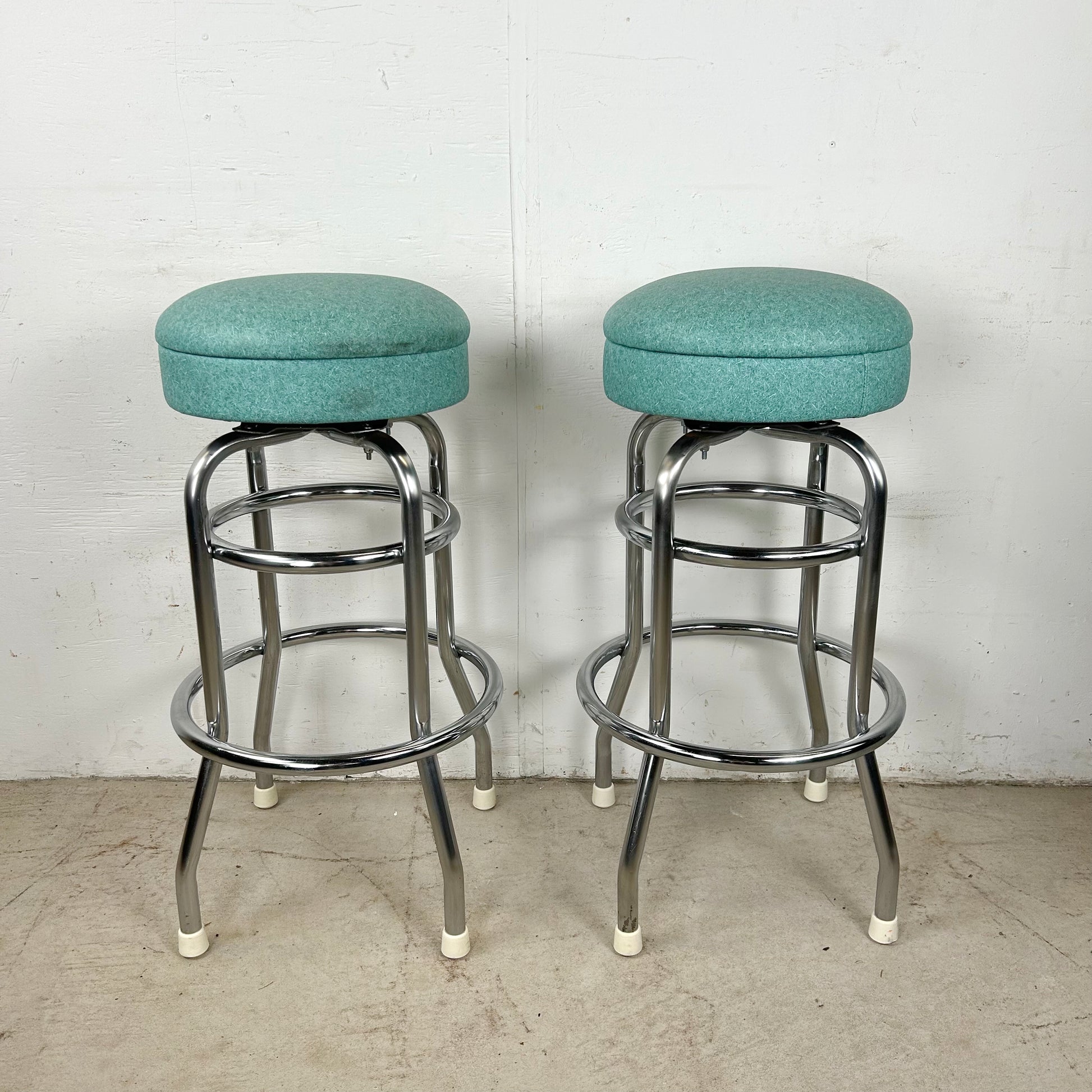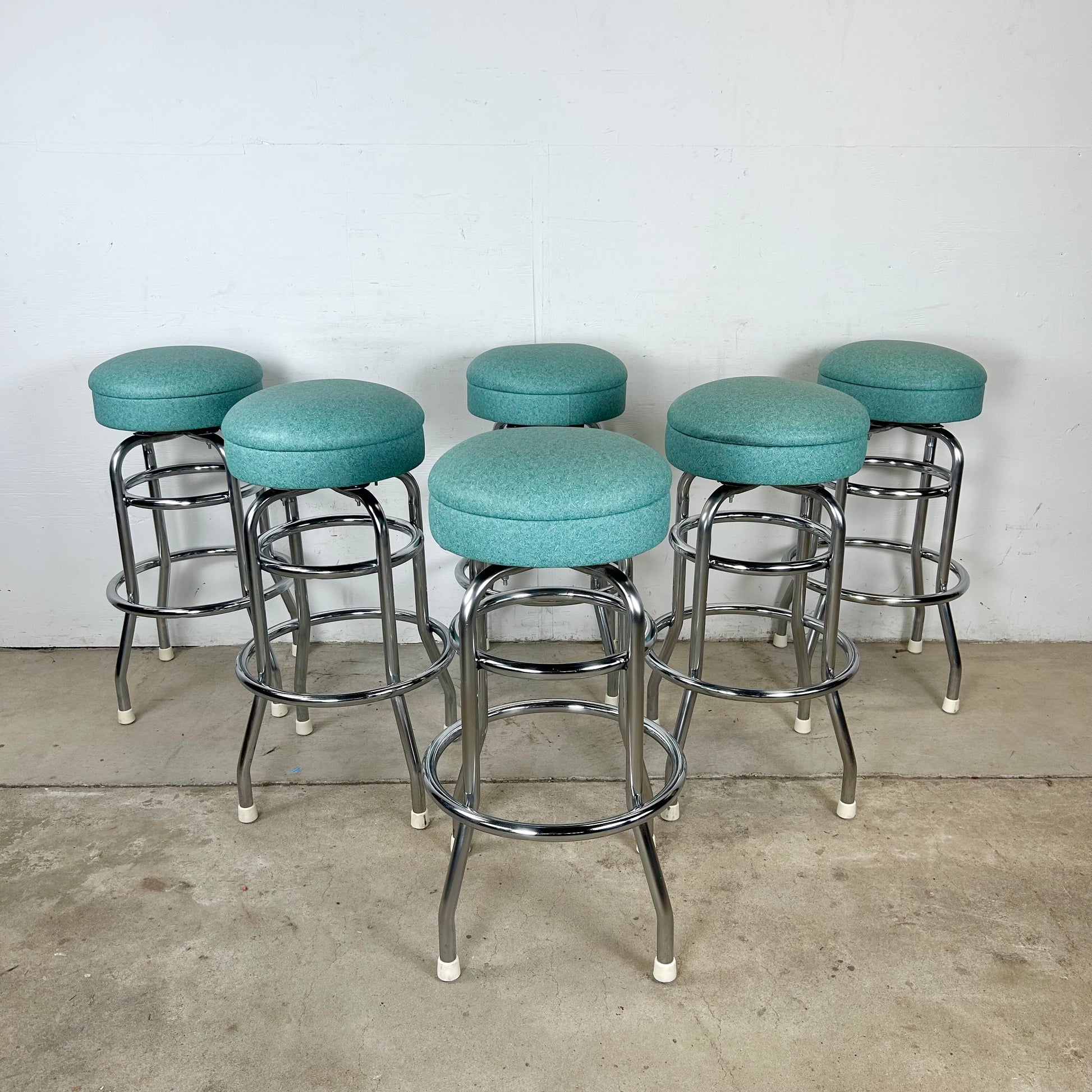 Create a welcoming atmosphere with this set of six vintage bar stools, perfect for kitchens, bars, or recreation rooms. Each stool is crafted with a tubular steel frame, rubber feet, and a padded vinyl swivel seat in aqua, a classic color of the 1960s. Together, they form a complete seating solution for social spaces.
